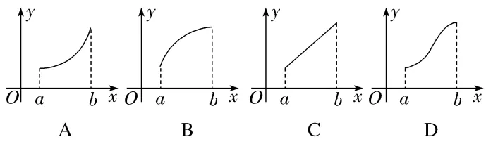 (2)函数f(x)的导函数f'(x)在[a,b]上单调递增,若对任意x1和x2满足a<x1<x2<b,则有f'(a)<f'(x1)<f'(x2)<f'(b),根据导数的几何意义,可知函数y=f(x)的切线斜率在[a,b]内单调递增,观察图象,只有A选项符合.