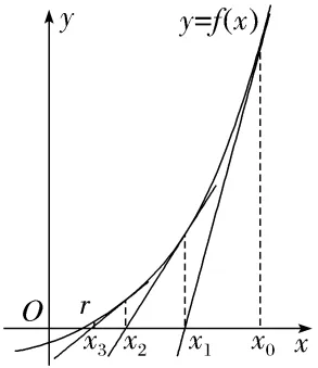 (f'(x0)≠0),称x1是r的一次近似值;在点(x1,f(x1))处作曲线y=f(x)的切线,则该切线与x轴的交点的横坐标为x2,称x2是r的二次近似值;重复以上过程,得r的近似值序列,其中xn+1=xn-