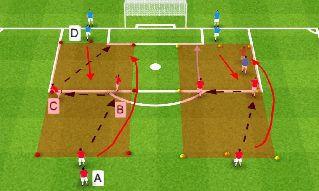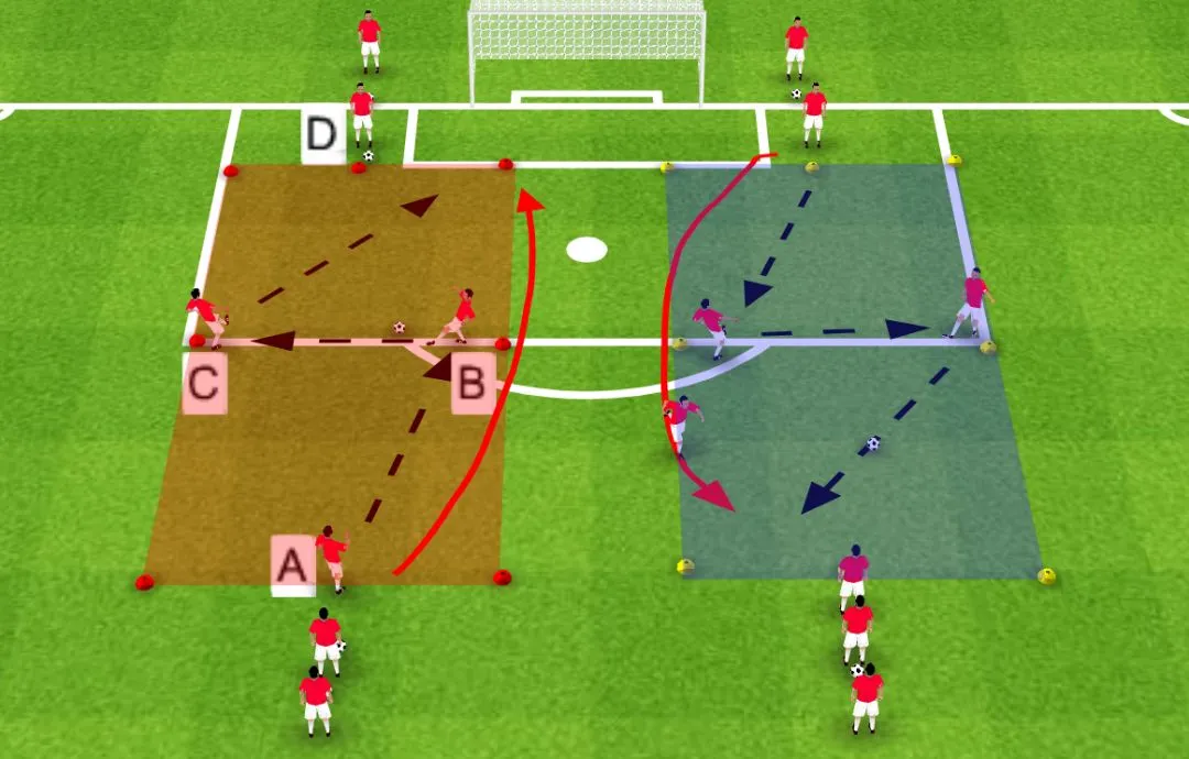 2. 球员A开始训练,他有两个传球选择(球员B或C),如果是传给球员B,则球员D要上前给予球员B防守压力,球员B接球后将球传给另一侧的球员C,球员C传球给后插上的A。