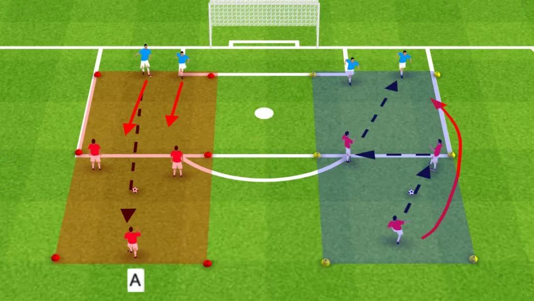 2. 防守球员开球,把球转给远处的的进攻球员A,开球之后后,3v2训练开始。