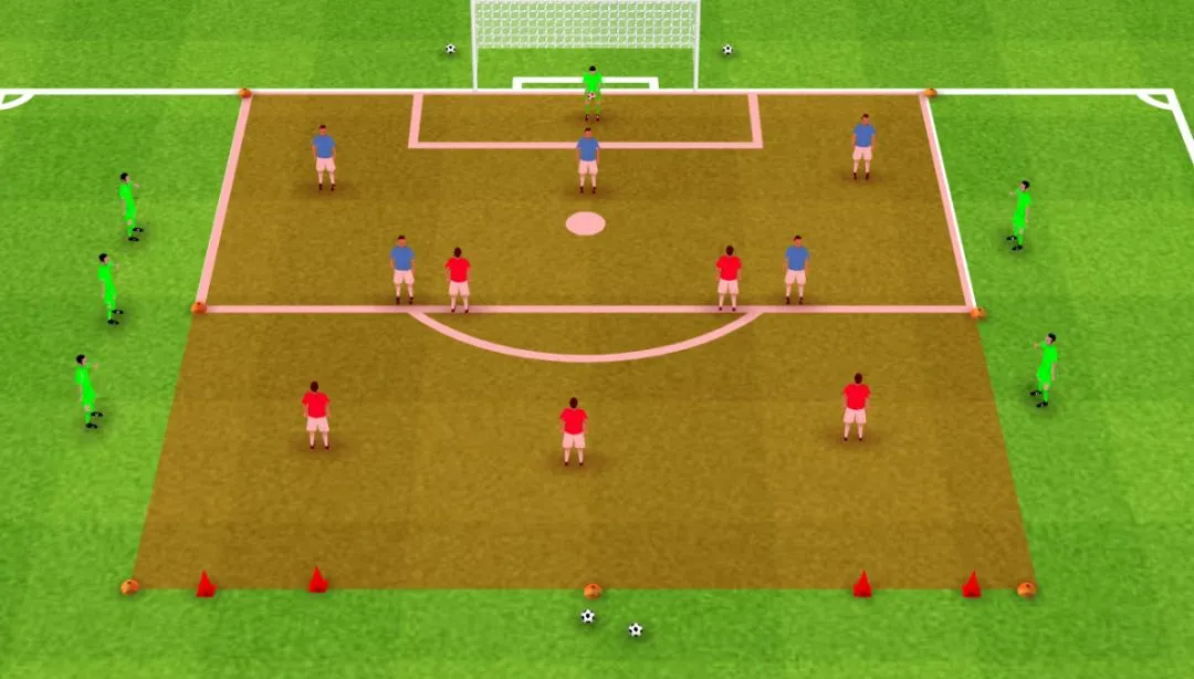 1. 场地设置如图所示,球员分成两队在场地内进行5v5训练,防守方拥有一个守门员;另一队在场边等待。