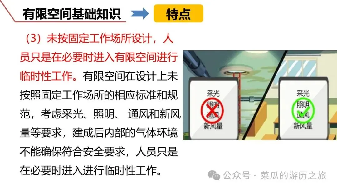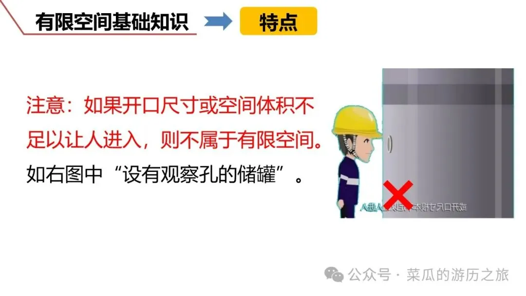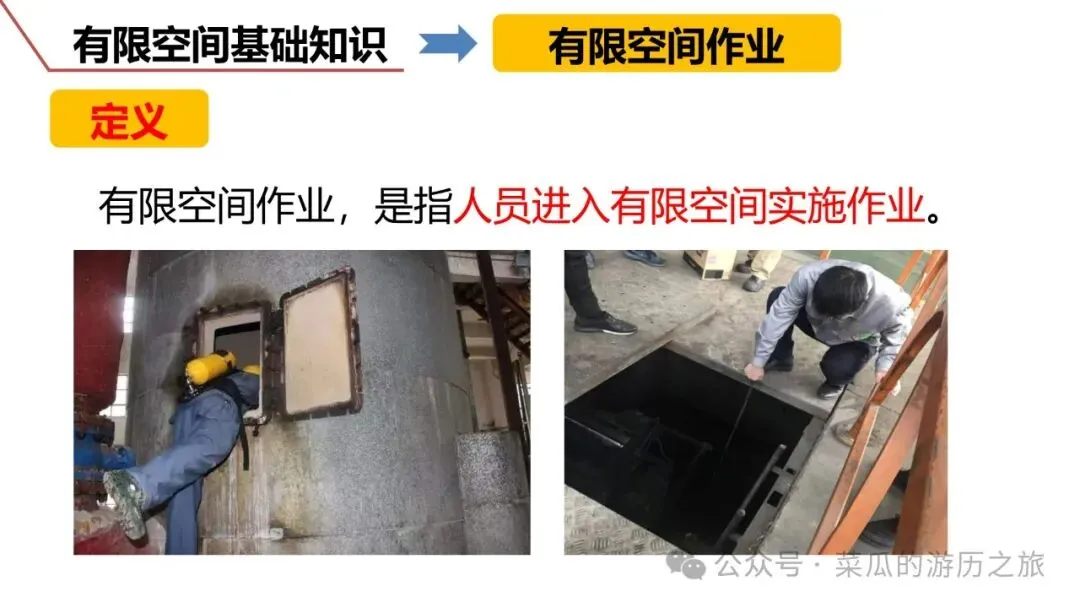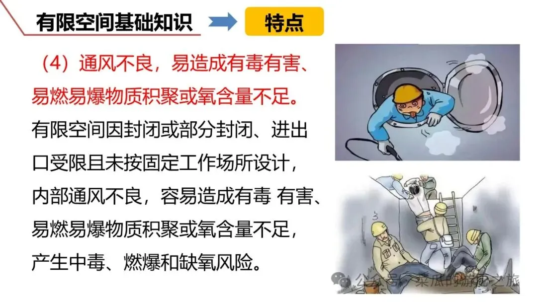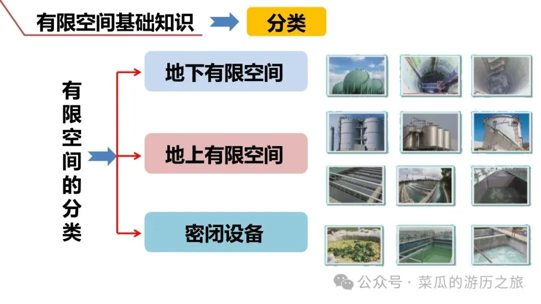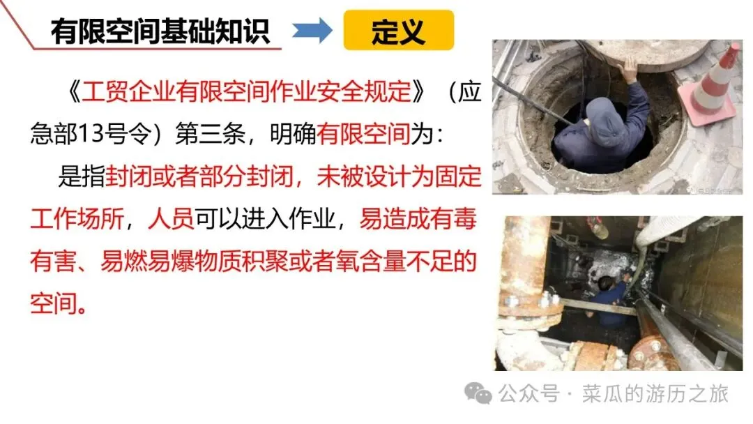 有限空间是指封闭或部分封闭、进出口受限但人员可以进入,未被设计为固定工作场所,通风不良,易造成有毒有害、易燃易爆物质积聚或氧含量不足的空间。分为地下有限空间、地上有限空间和密闭设备3类。