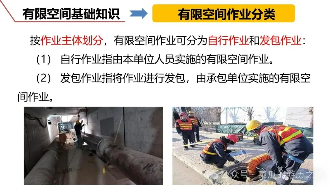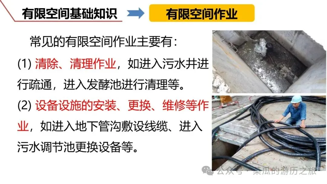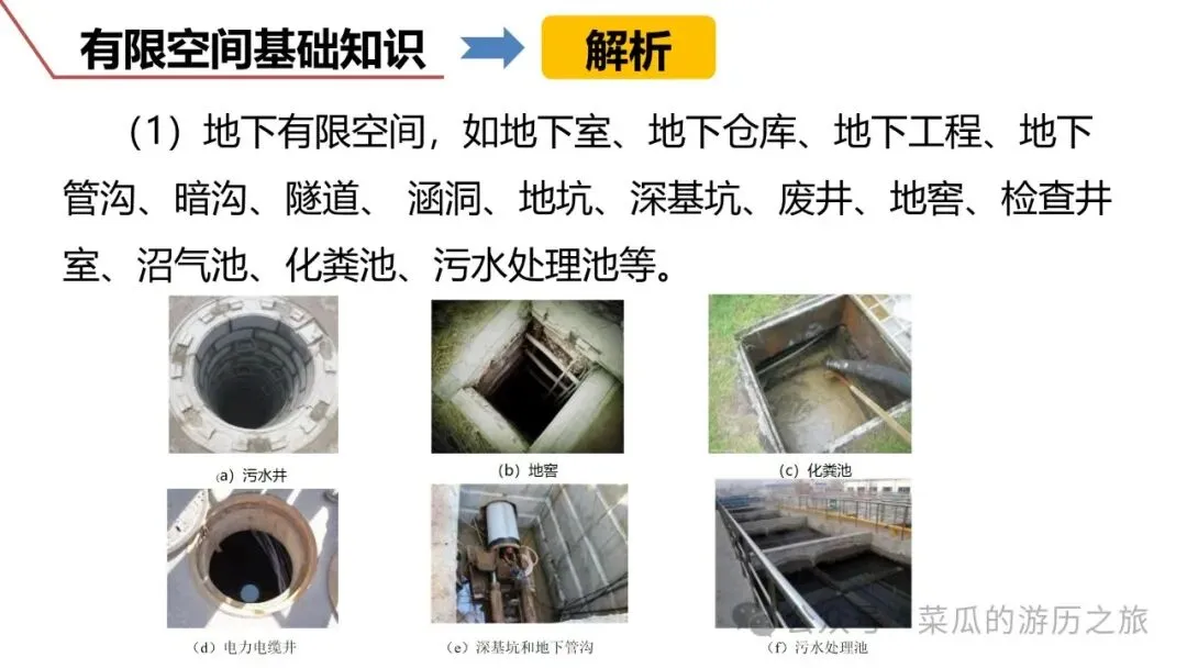 ❶ 地下有限空间,如地下室、地下仓库、地下工程、地下管沟、暗沟、隧道、 涵洞、地坑、深基坑、废井、地窖、检查井室、沼气池、化粪池、污水处理池等。
