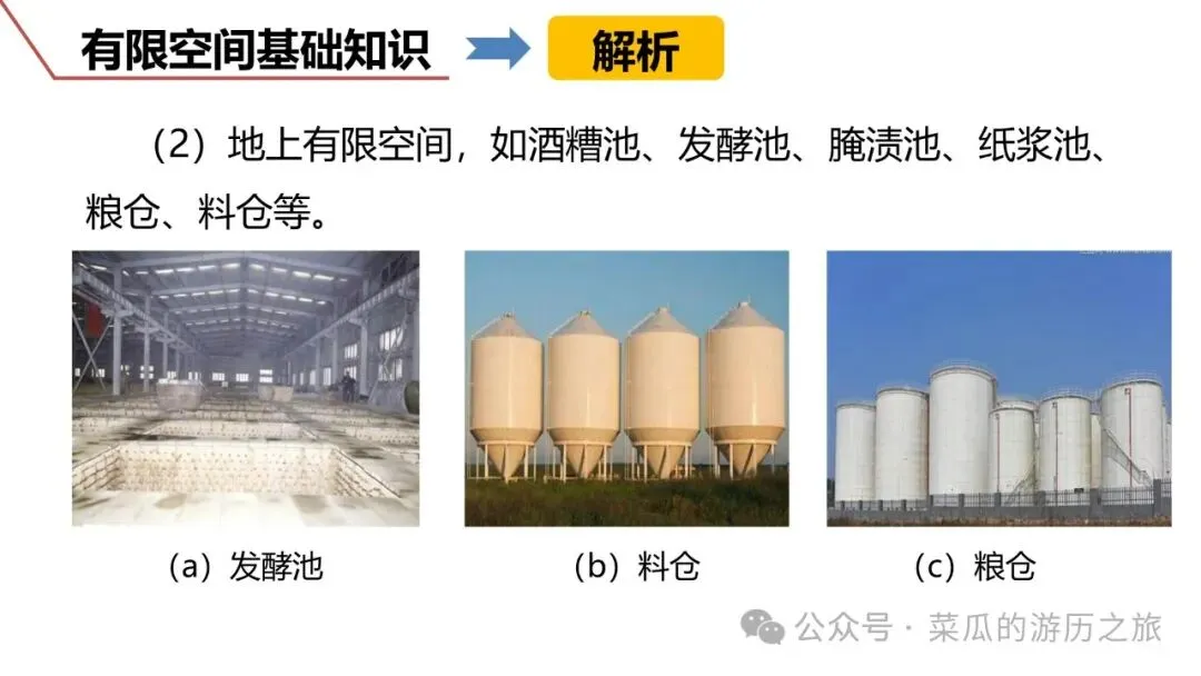 ❷ 地上有限空间,如酒糟池、发酵池、腌渍池、纸浆池、粮仓、料仓等。