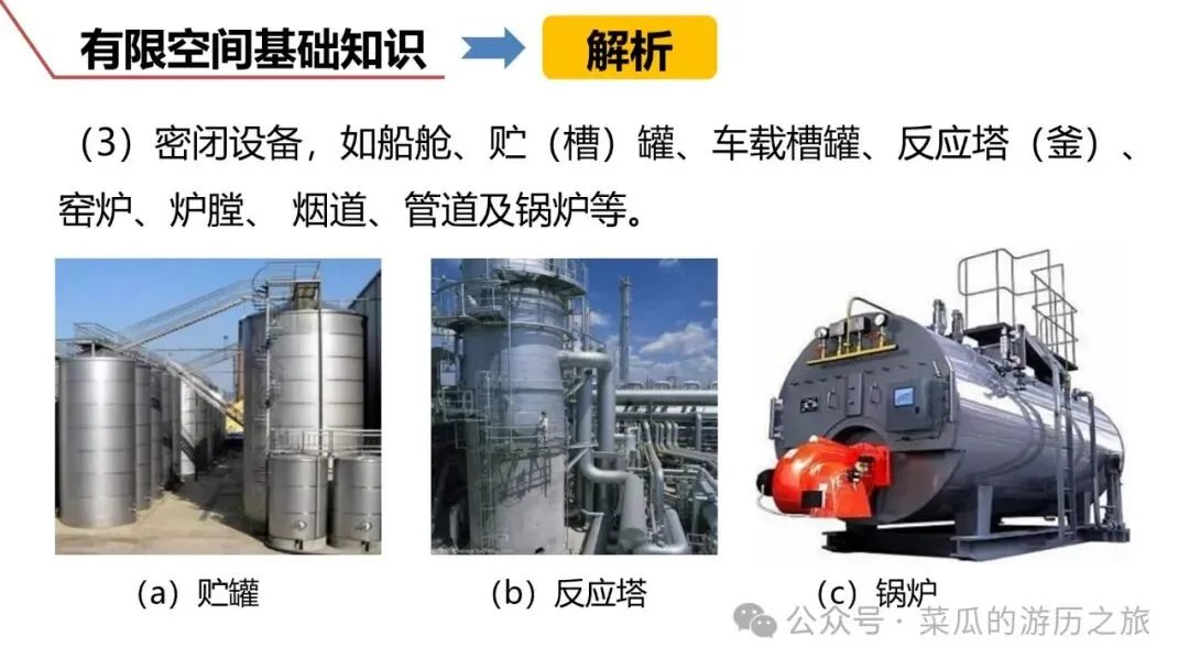 ❸ 密闭设备,如船舱、贮(槽)罐、车载槽罐、反应塔(釜)、窑炉、炉膛、 烟道、管道及锅炉等。