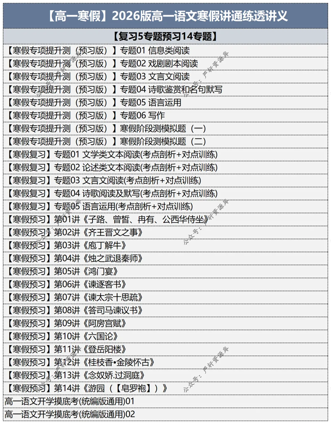 1️⃣『2026高一语文寒假讲通练透」(预习为主兼顾复习)讲练结合,包含知识点,例题,练习题等。重点预习下学期内容(期中前),兼顾复习,并配成果测试卷,开学摸底卷,并配寒假预习版汇总专项练如作文阅读文言文诗歌等。讲练结合。教师版+学生版
