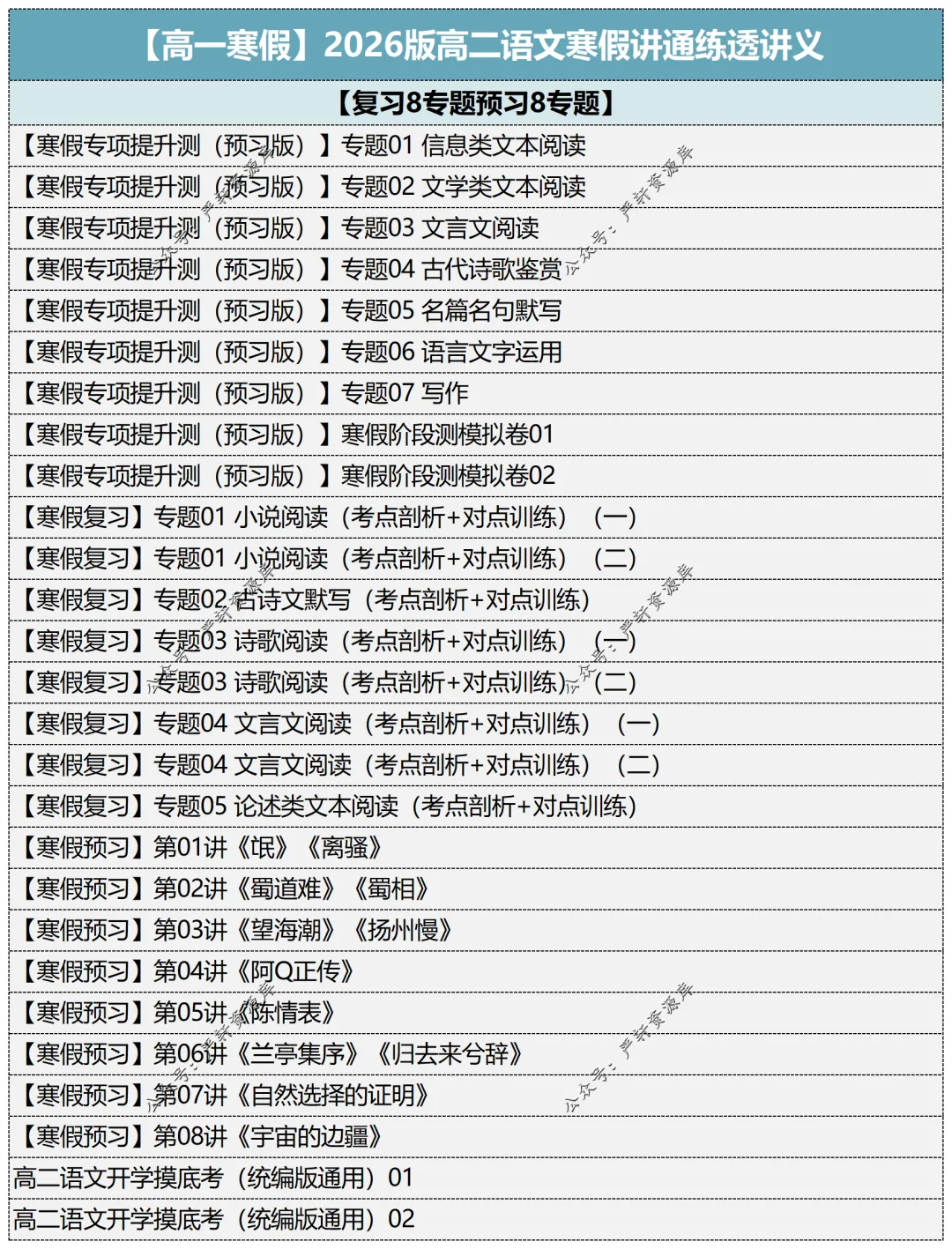 3️⃣『2026高二语文寒假讲通练透」(预习为主兼顾复习)讲练结合,含有知识点,例题练习题等。重点预习下学期内容。并配成果测试卷,配开学摸底卷,配寒假预习版汇总专项练如阅读作文文言文写作等。讲练结合。教师版+学生版