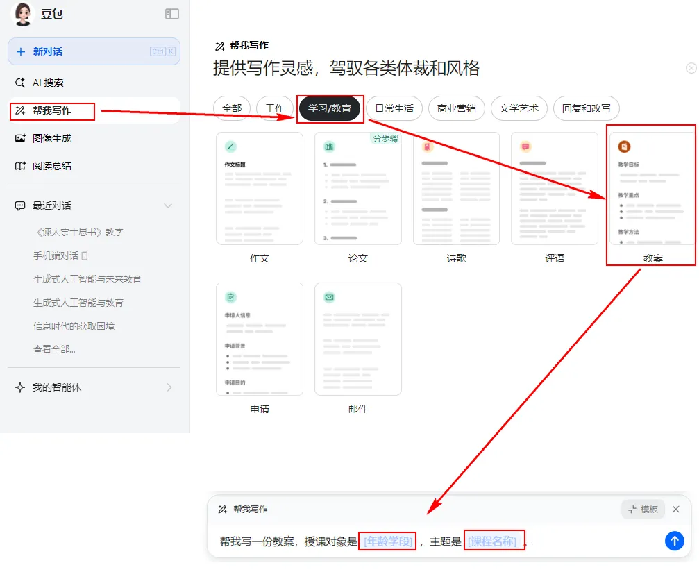 其中,由于“豆包”自带了撰写教案的功能,有默认的提示词,因此我既使用了豆包默认的提示词、也使用了我专门设计的提示词,让豆包分别输出教案。