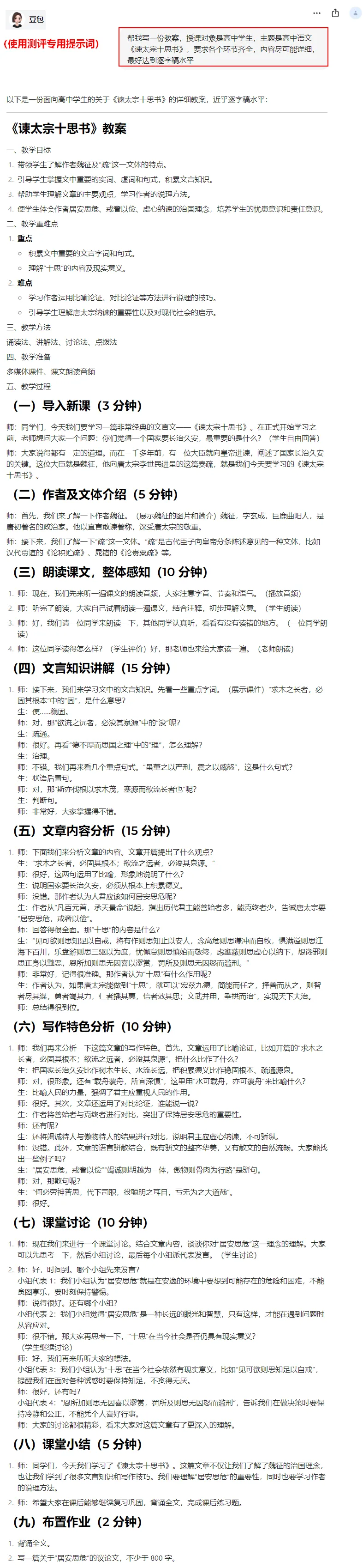 豆包(专用提示词)是本次测评中,唯一达到“逐字稿”水平的,而且教学环节、内容安排合理,尤其还提供了师生对话的设计,真的是相当详细!
