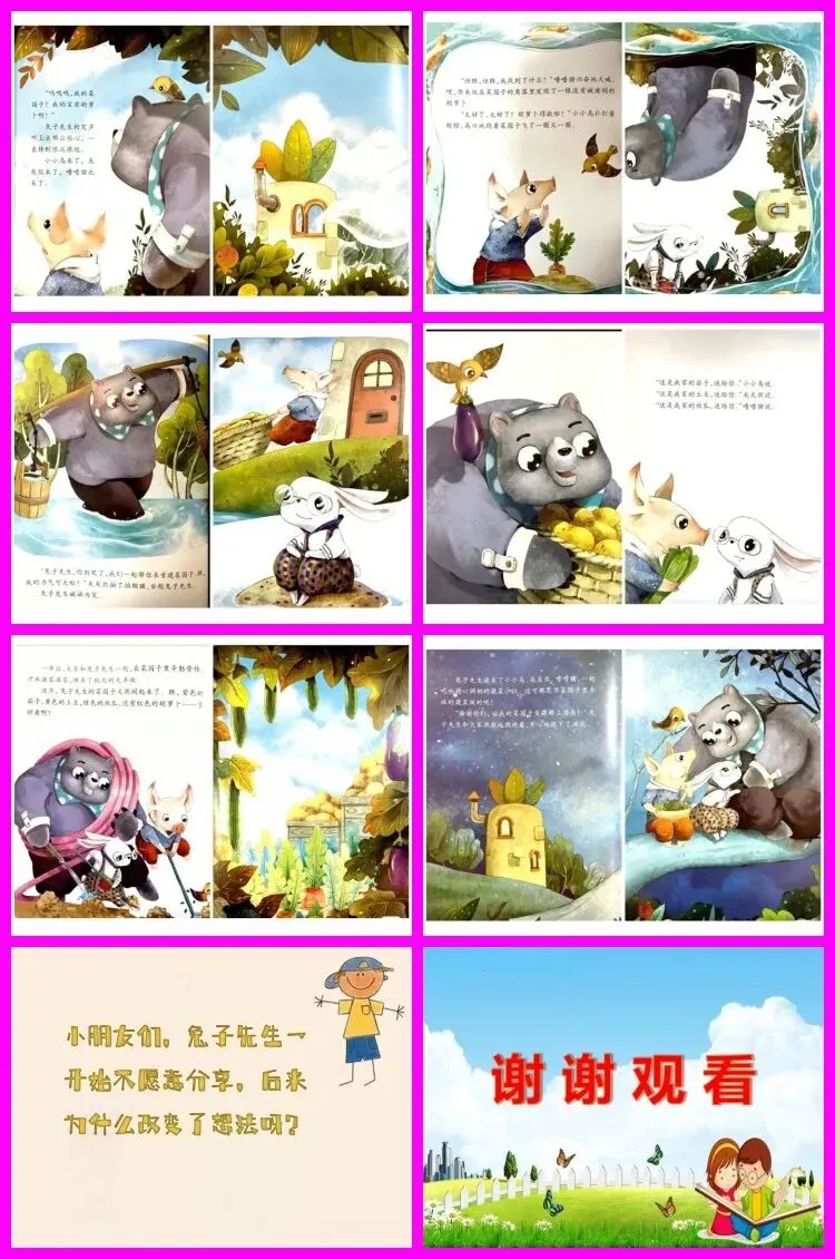 1.认知目标:理解绘本故事的主要情节,知道兔子先生从拒绝分享到学会分享的转变过程,能说出故事中的主要角色(兔子先生、小小鸟、灰灰熊、噜噜猪)和关键物品(胡萝卜、茄子、土豆、丝瓜)。