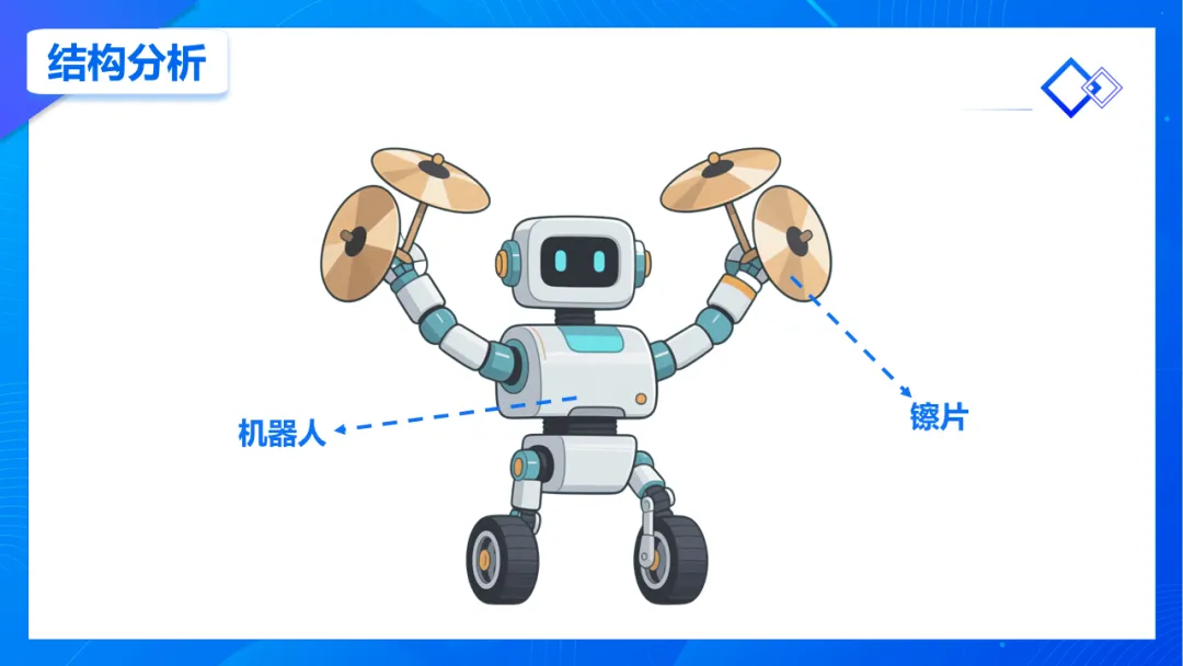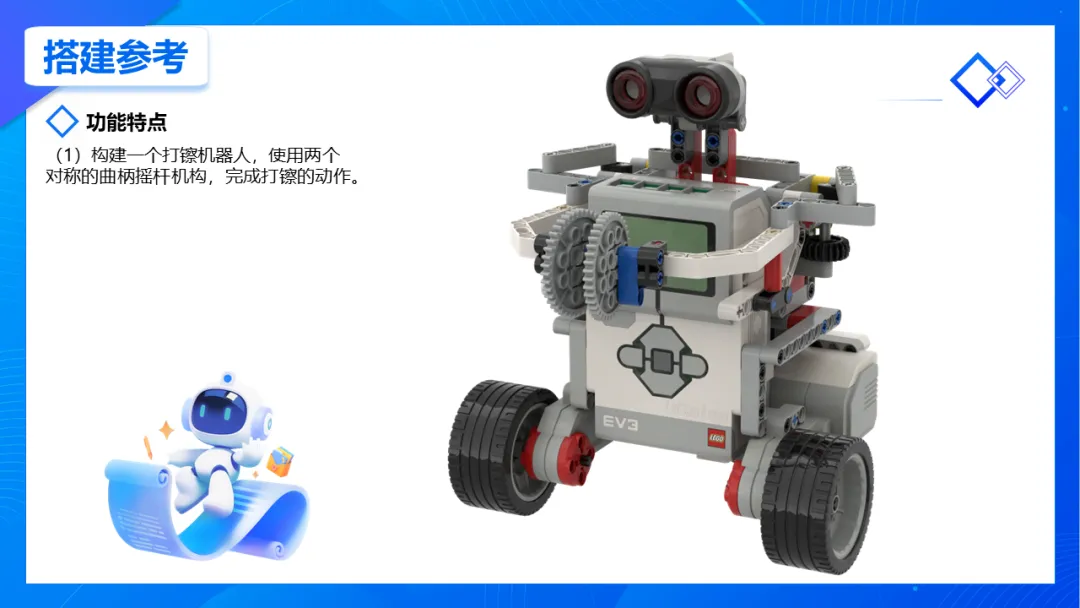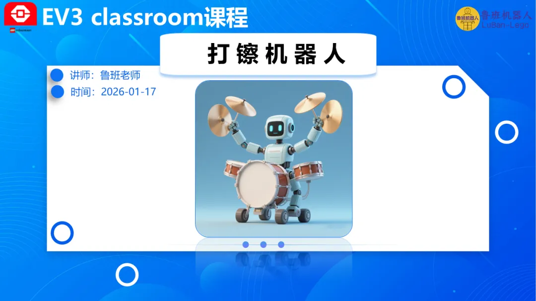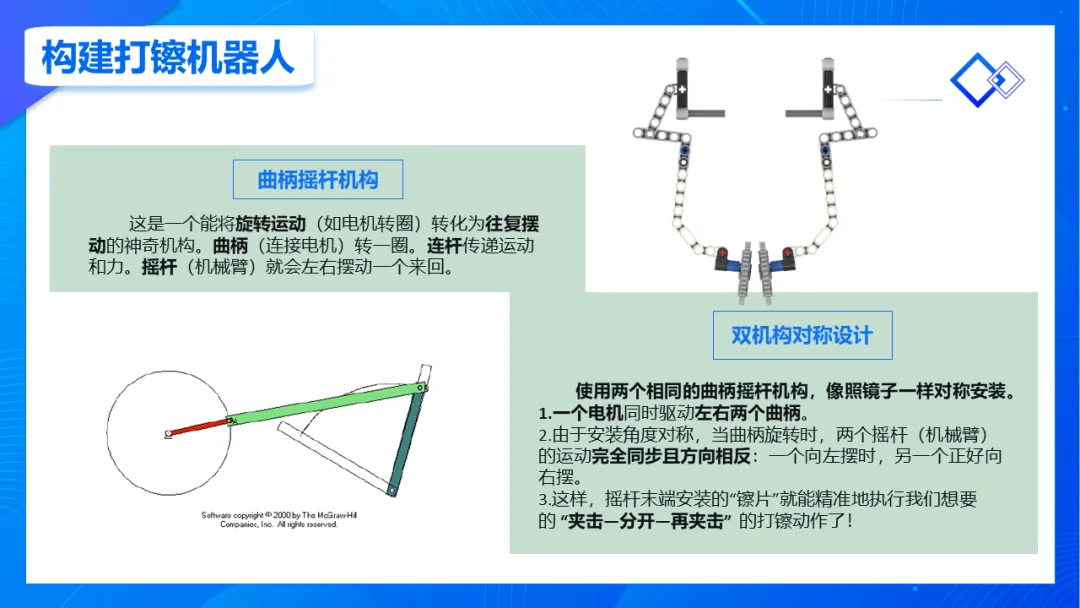 ①理解曲柄摇杆机构如何将旋转运动转化为往复摆动,并能解释利用两个对称机构实现同步开合运动的机械原理。②搭建出采用对称曲柄摇杆机构机械臂的打镲机器人,并编写多分支控制程序,实现四种不同运动模式(原地、行进、旋转、停止)的打镲功能。③通过对传统乐器“镲”的发声原理与动作进行分析,建立将真实世界问题抽象为可被机器人执行的工程解决方案的计算思维。导课视频:视频展示了民间打镲表演(课件中包含原视频)。EV3打镲机器人作品运行视频(课件中包含原视频)。课件包含详细编程讲解,提供新版与旧版程序源文件,这里只展示1页。课程总结,这部分内容主要是方便老师做课后反馈,发家长群使用,老师们请根据自己的需要做适当更改。尊敬的家长您好!