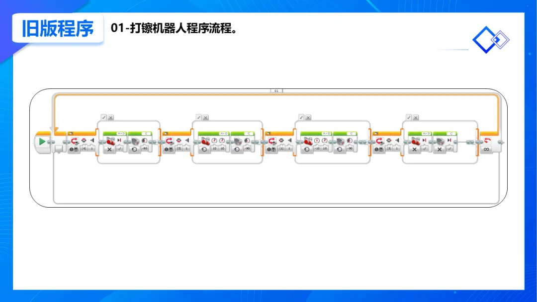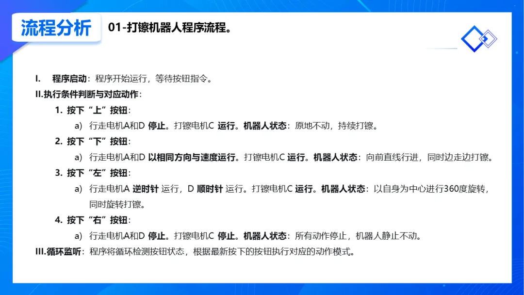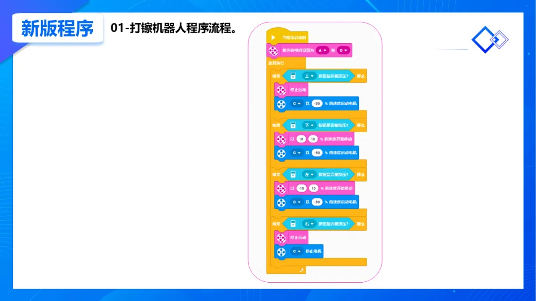 编程部分更具综合性,孩子们为机器人注入了“灵魂”:通过编写多条件判断程序,实现了原地、行进、旋转、停止四种打镲模式,用一个控制器灵活指挥机器人,锻炼了逻辑思维与系统集成能力。