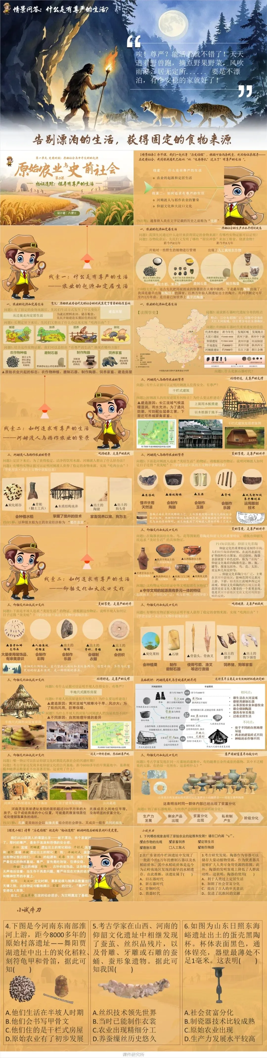 这节课以 “探寻原始社会人们追求有尊严生活的历程与表现” 为主线。从原始农业的起源切入,围绕河姆渡文化、仰韶文化、大汶口文化等不同史前文化遗址,结合出土文物、生产生活方式等内容,引导学生探究原始社会人们在获取稳定食物来源、改善居住条件、发展精神文化等方面的实践,展现原始社会人们为追求有尊严生活所做的努力与创造。