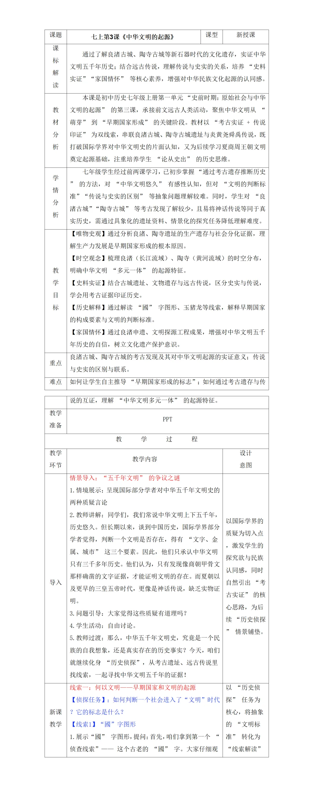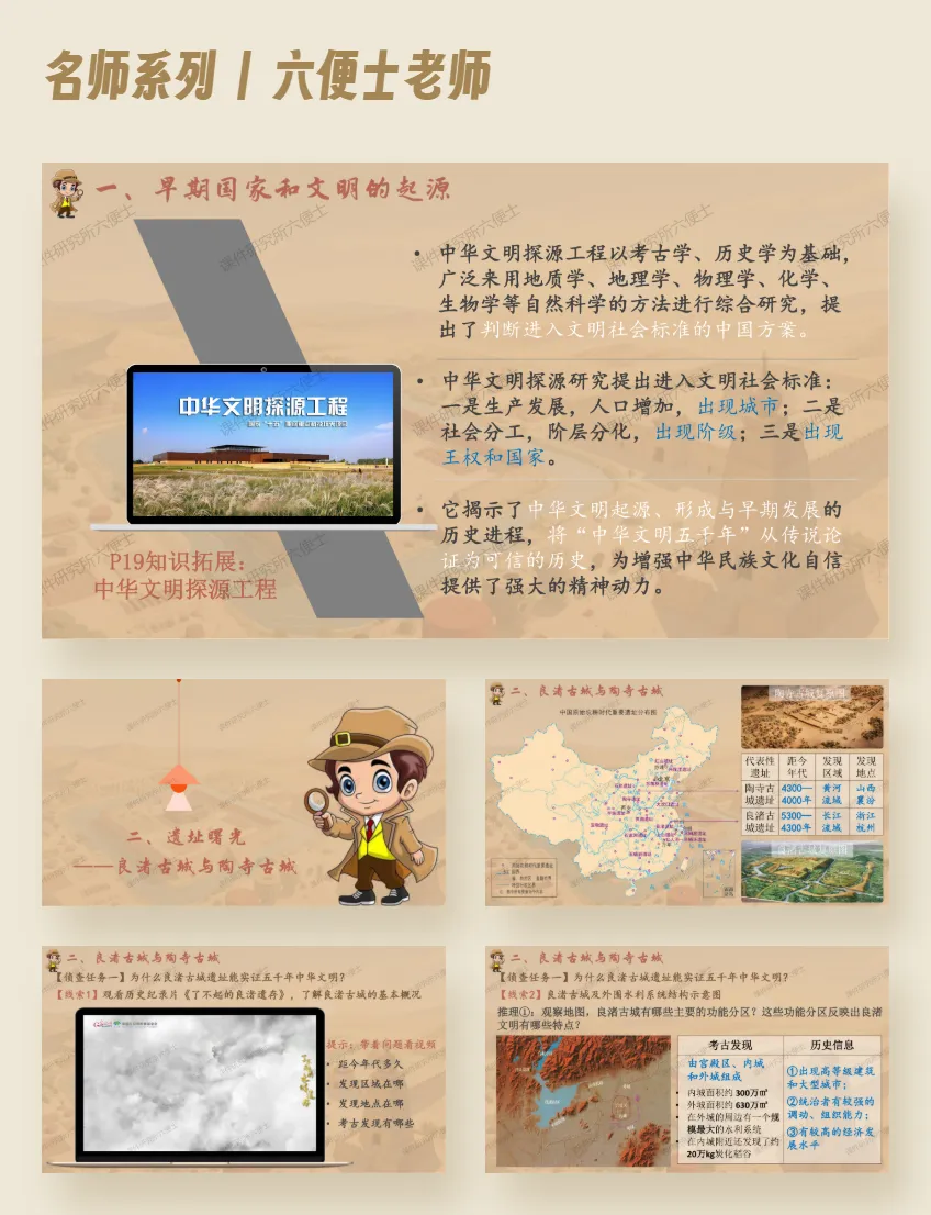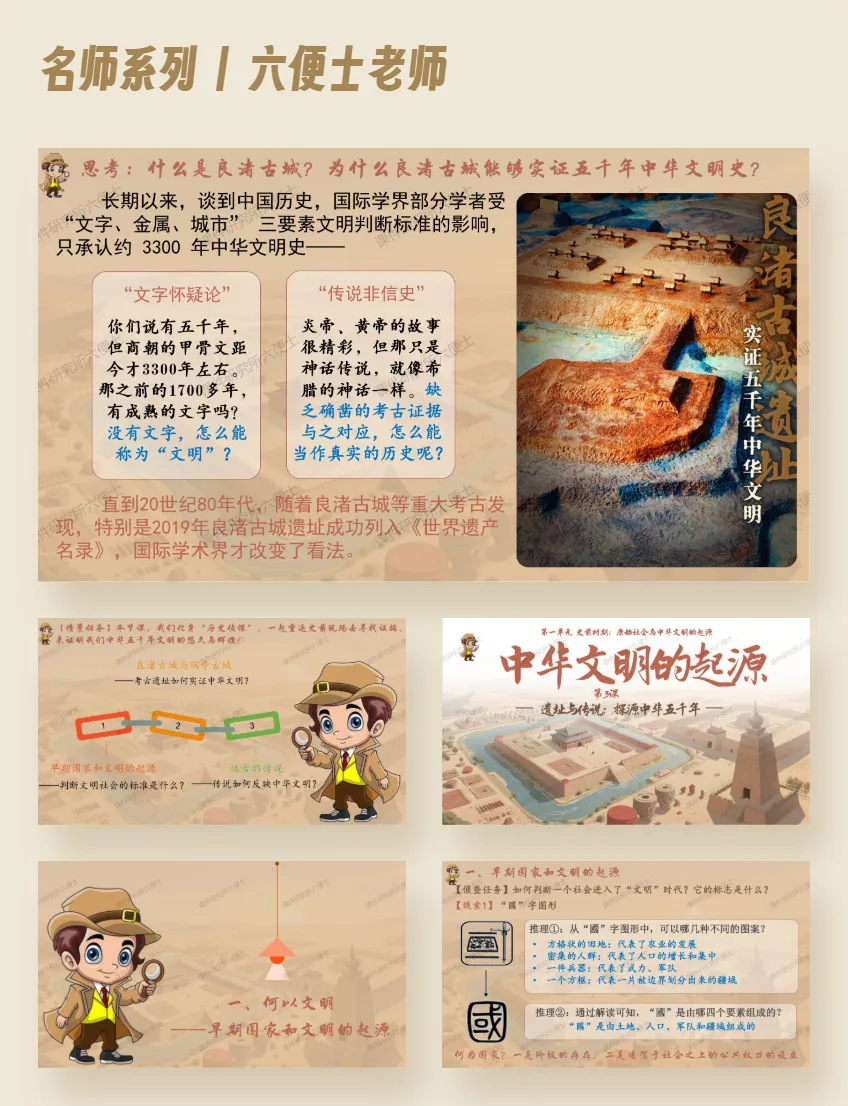 再来看看第三课《中华文明的起源》,该课件以 “‘考古实证 + 传说印证’双路径探究中华文明起源与多元一体特征” 为主线,采用 “化身‘历史侦探’实证中华文明起源” 的情境,通过 “线索 + 推理 + 结论” 的侦探逻辑,围绕文明判断标准、良渚与陶寺古城遗址实证、远古传说佐证展开,验证中华文明五千年历史,体现多元一体特点。