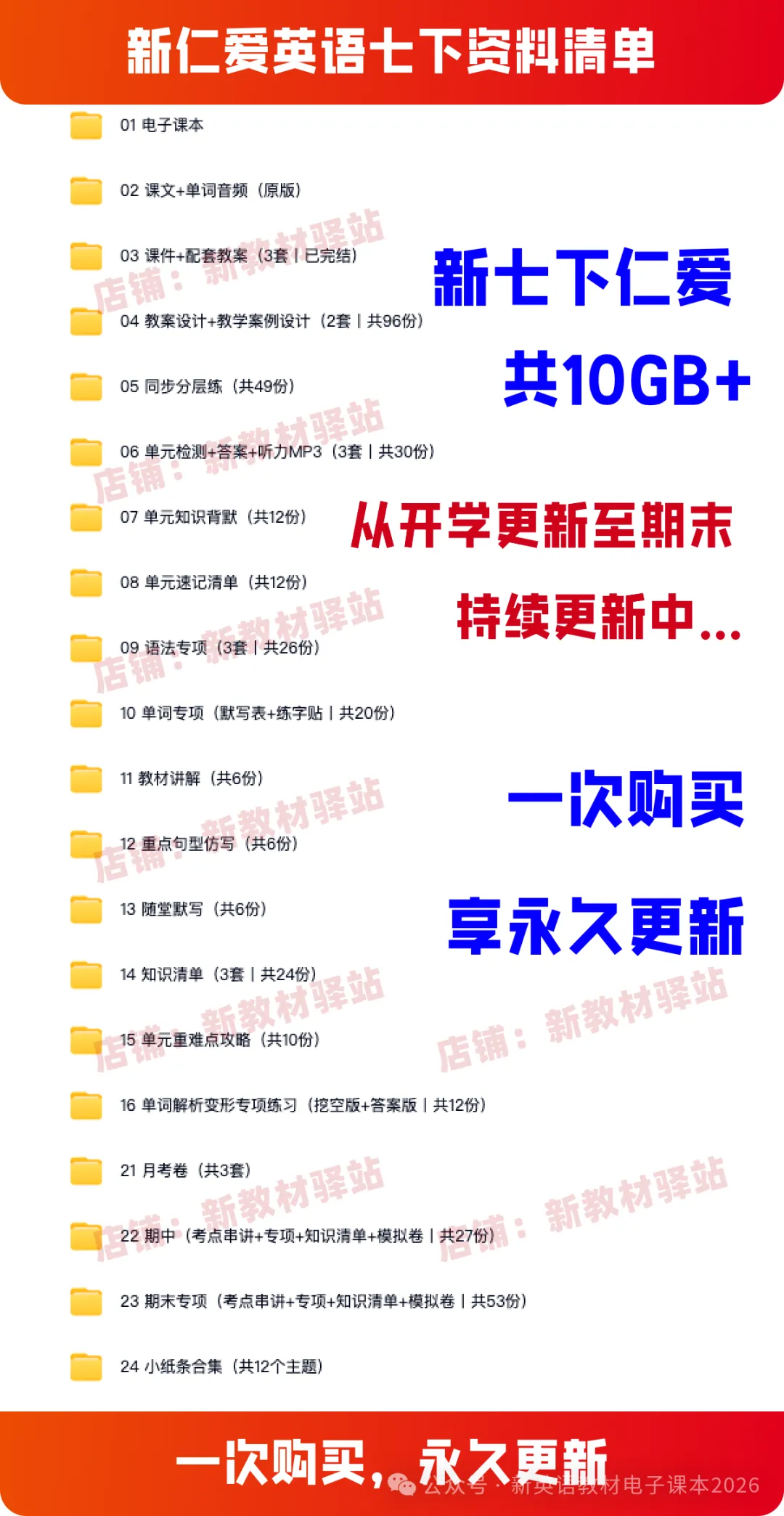 2026春重新整理,分类归纳新仁爱版英语七下资源(含电子课本+课件PPT+教学设计+教学计划+分层练+单元测+期末试卷+期中试卷+语法讲练+作文提升+单词字帖背默表+单词课文音频MP3)。文末获取下载方式!
