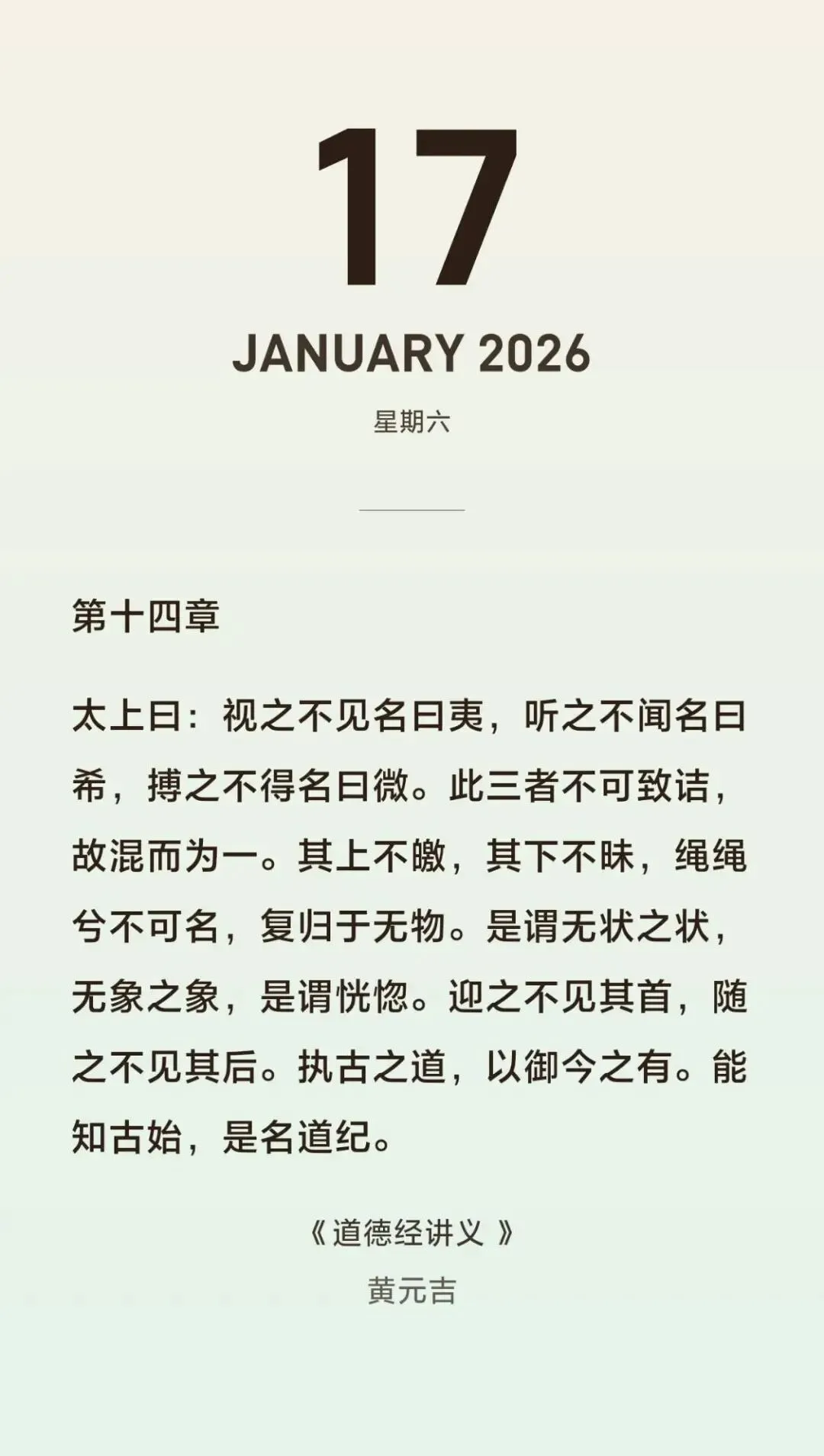 最高的境界是:看它却看不见,称它为“夷”;听它却听不到,称它为“希”;摸它却摸不着,称它为“微”。这三者无法进一步探究,所以它们浑然合一。它的上面不显得明亮,下面也不显得昏暗,绵延不绝啊,难以用名称来界定,最终回归到没有具体形态的状态。这就叫做没有形状的形状,没有形象的形象,这称为“恍惚”。迎着它,看不见它的开端;跟着它,看不见它的末尾。把握着自古以来的“道”,用来驾驭当今的具体事物。能够知晓远古的本始,这就叫做“道”的纲纪。