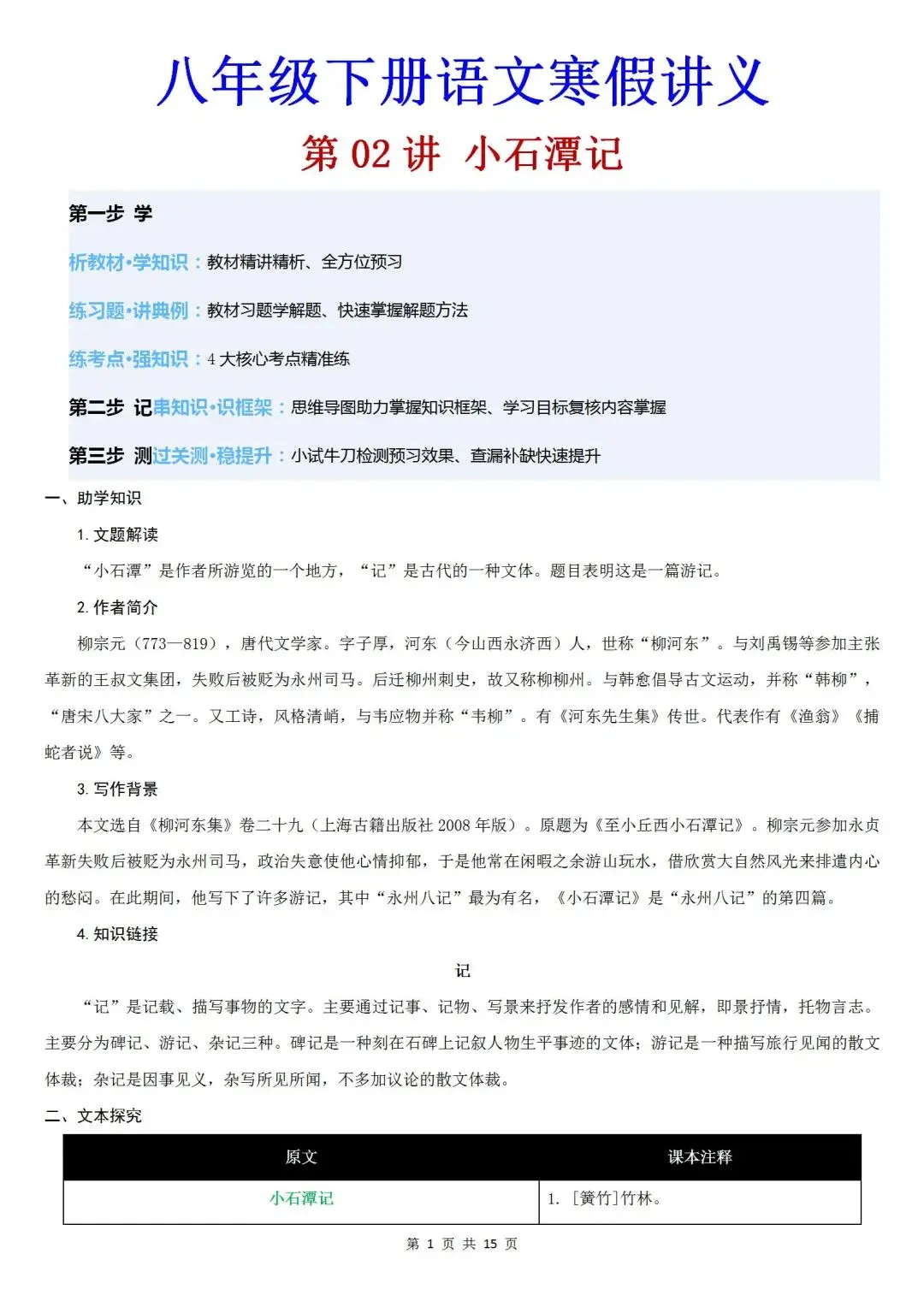 本文选自《柳河东集》卷二十九(上海古籍出版社2008年版)。原题为《至小丘西小石潭记》。柳宗元参加永贞革新失败后被贬为永州司马,政治失意使他心情抑郁,于是他常在闲暇之余游山玩水,借欣赏大自然风光来排遣内心的愁闷。在此期间,他写下了许多游记,其中“永州八记”最为有名,《小石潭记》是“永州八记”的第四篇。