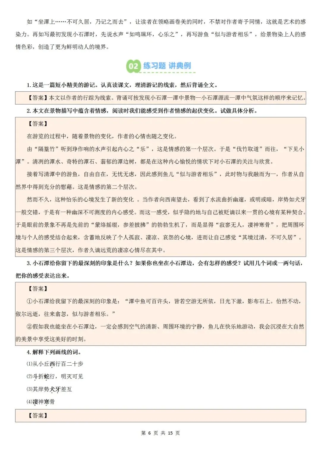 答案:本文是按游览的先后顺序来写景抒情的,具体:发现小石潭—潭中景物—小潭源流—潭中气氛。小石潭的特点:幽静。