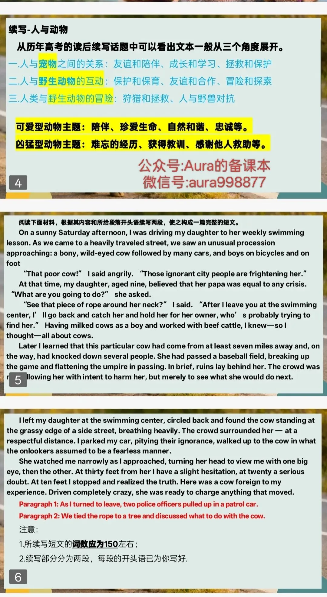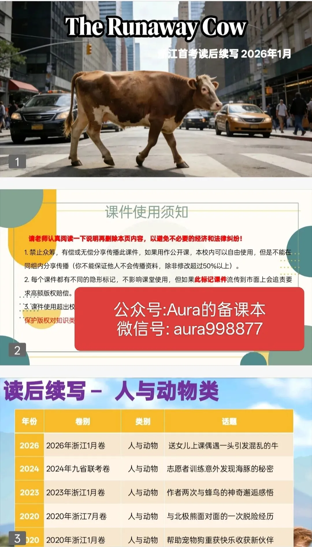 《2026年1月浙江首考读后续写课件》是一份针对浙江省高考英语读后续写题型设计的专项教学资料,聚焦“人与动物”类主题,具有以下特点: