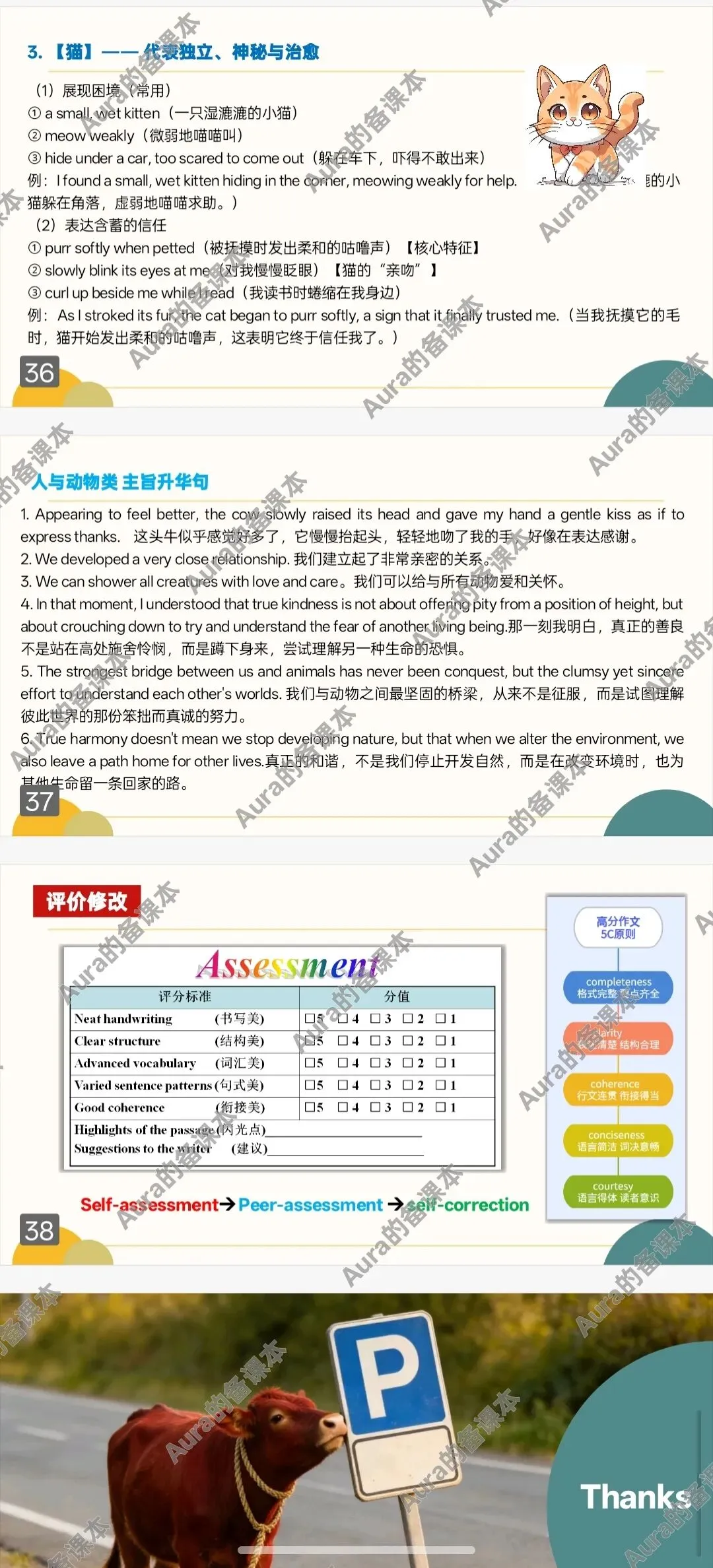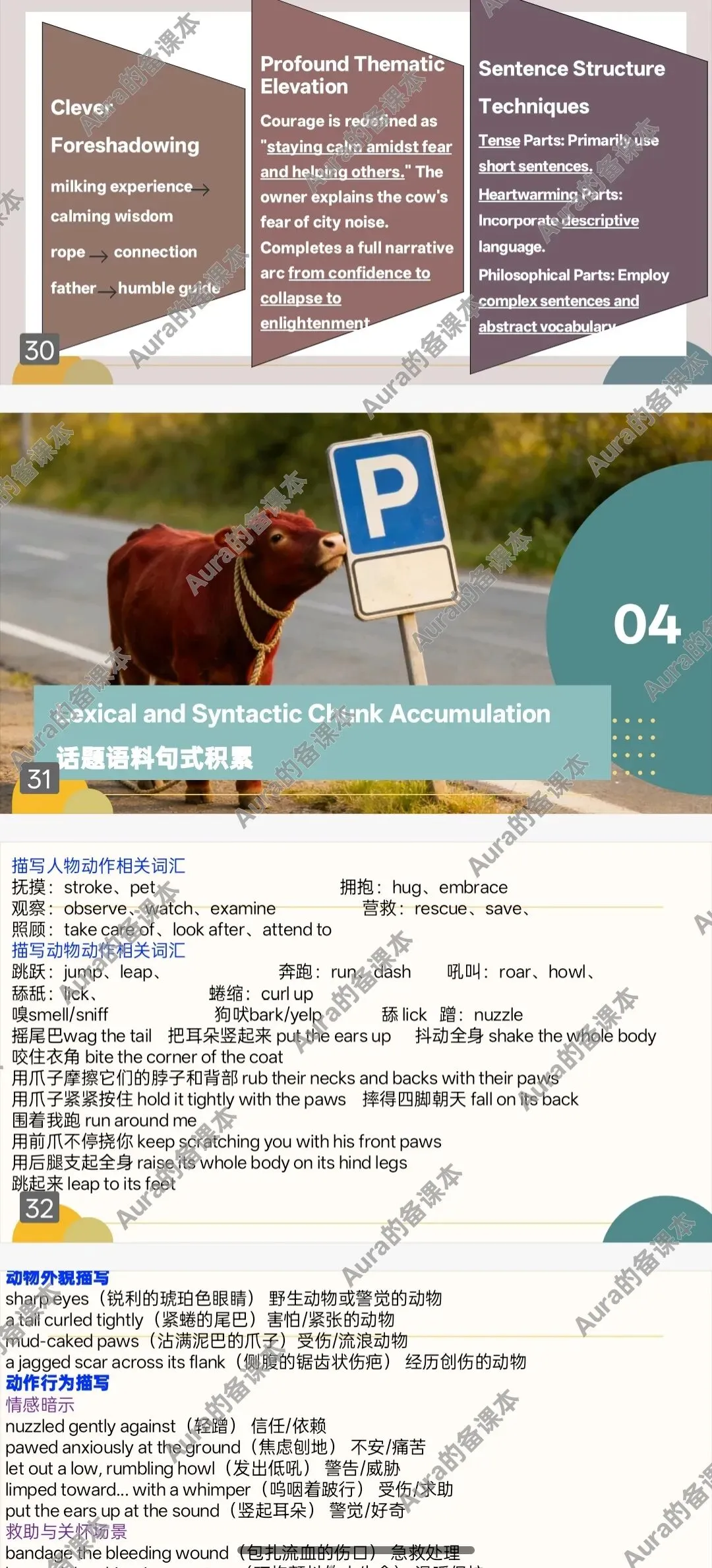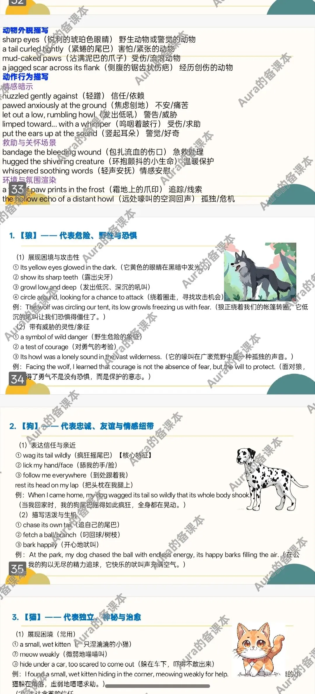 课件提取原文中的复合句、非谓语结构等高级句式进行解析,并分类整理人与动物主题的描写语料库,提供可直接迁移运用的表达资源。