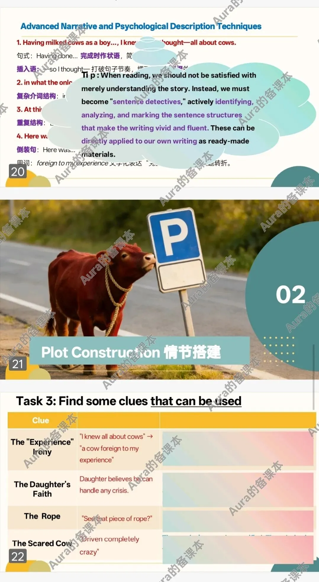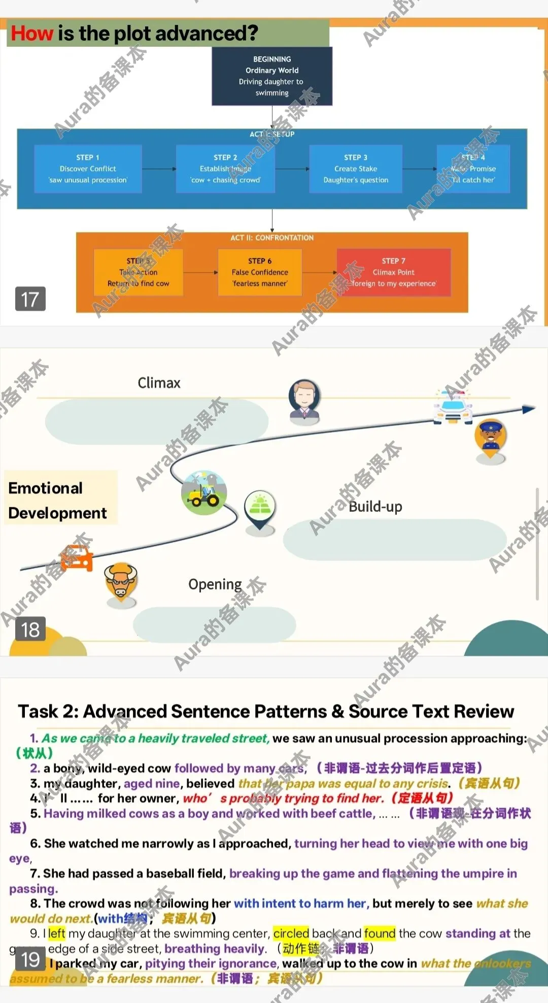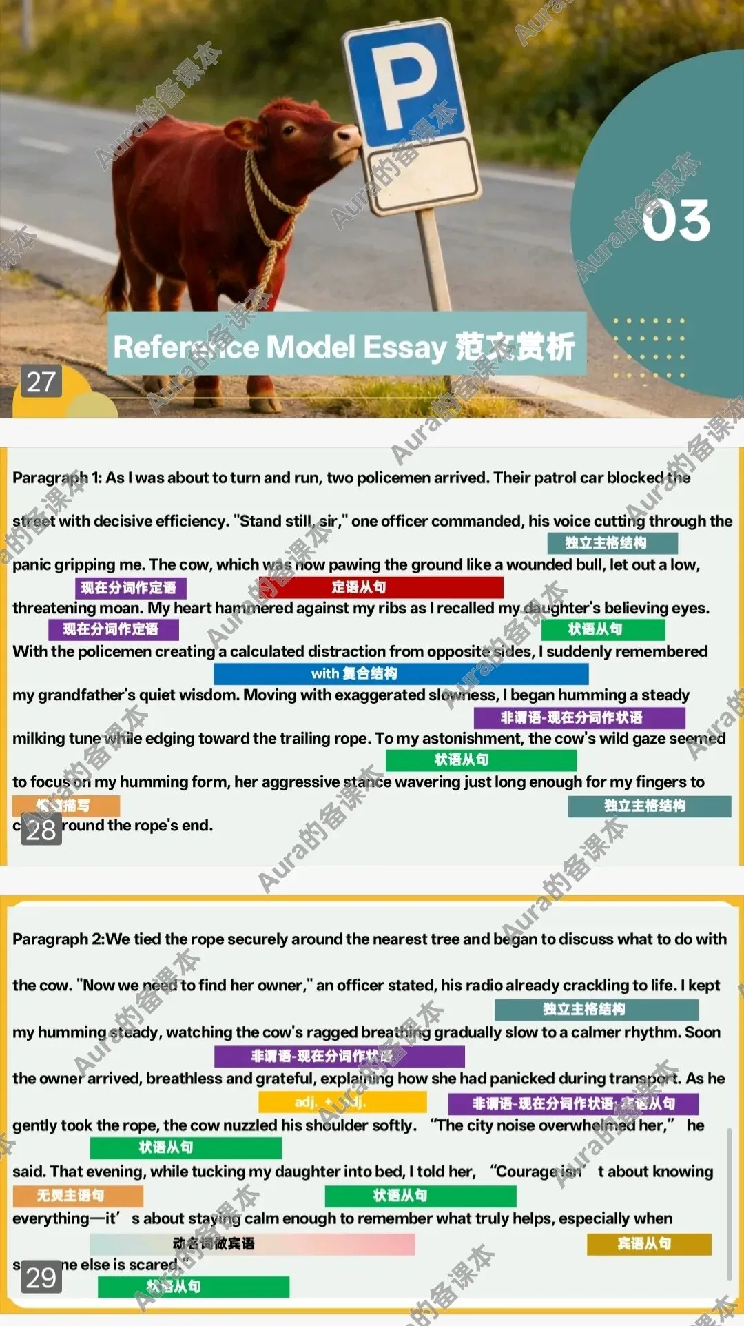 课件提取原文中的复合句、非谓语结构等高级句式进行解析,并分类整理人与动物主题的描写语料库,提供可直接迁移运用的表达资源。