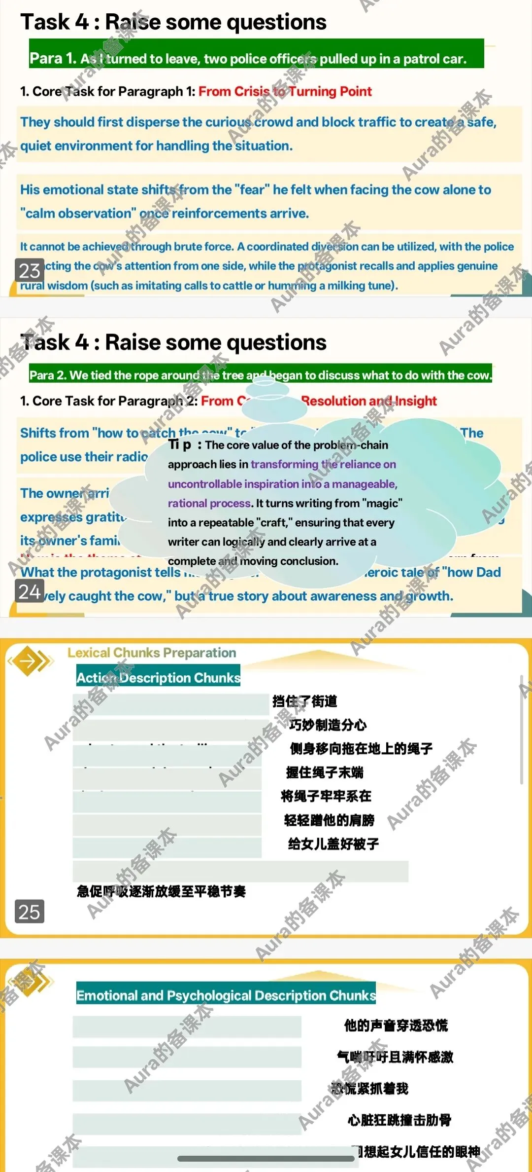 通过5W1H分析、问题链设计等教学方法,引导学生逐步理解文本内在矛盾与情感推进,将写作过程转化为可操作、可训练的思维步骤。