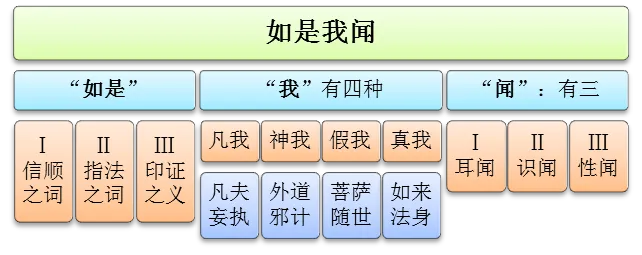 我闻:约理即以无我之真我,起不闻之真闻,闻如是之法,法法皆如,法法皆是,唯一如来藏性,为此经之理体,是为闻成就。