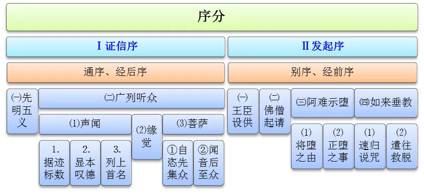 一、起教因缘分;二、圣教所说分;三、信受奉行分;