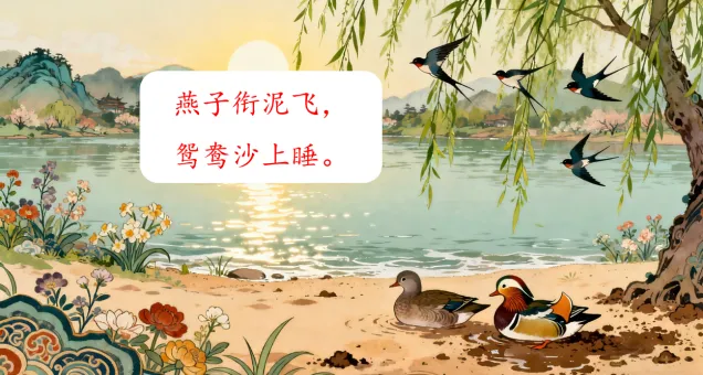 师:同学们,这个单元我们跟随课文,踏上了“四季生灵发现之旅”,大诗人杜甫为我们描绘了——燕子衔泥飞、鸳鸯沙上睡的春日安宁;