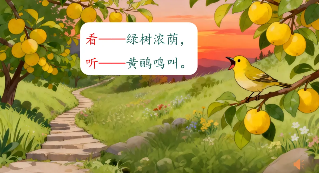 曾几则带领我们漫步在山路上,看——绿树浓荫,听——黄鹂鸣叫。