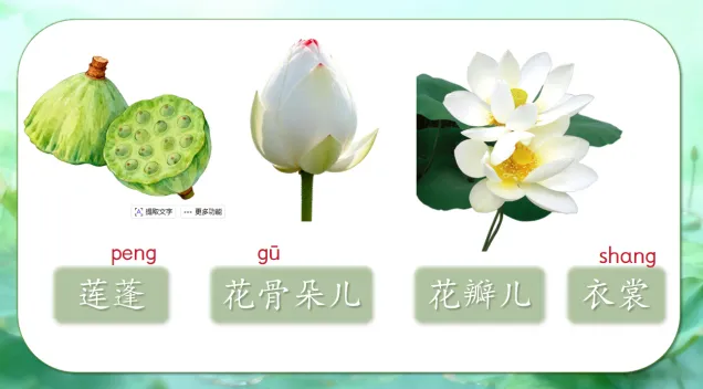 师:第一组词都是描写荷花美丽的样子,我们一起读读——生:莲蓬 花骨朵儿 花瓣儿 衣裳