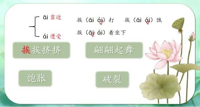 师:没错,“挨”就是靠近的意思。当它表示“遭受”的意思时,读“ái”,现在你能根据“挨”的意思,为下列词语选择正确的读音吗?