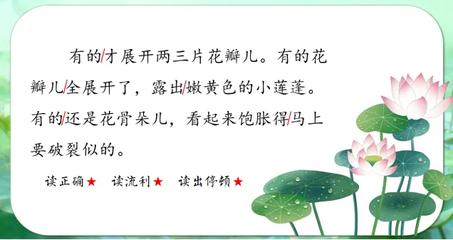 师:孩子们,想要读好停顿,我们可以借助停顿魔法棒,看着这些提示,谁再来读一读,读出荷花不同的样子?
