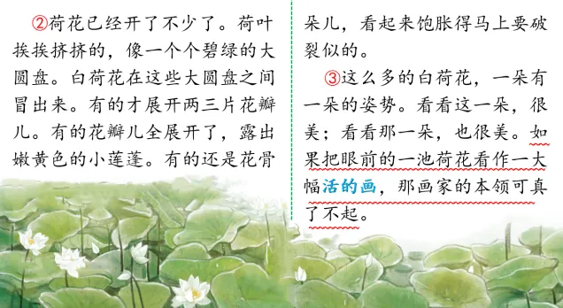 生:如果把眼前的一池荷花看作一大幅活的画,那画家的本领可真了不起。