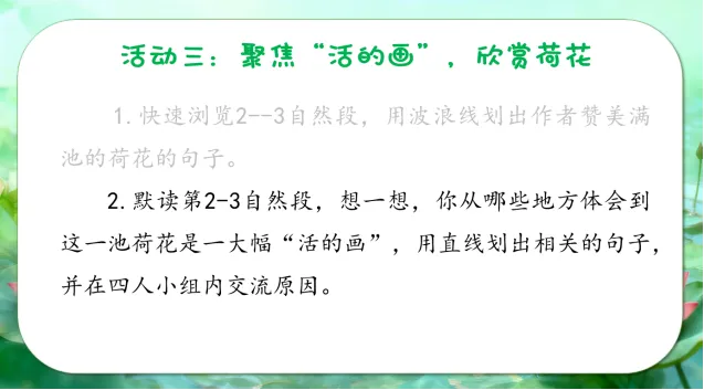 师:在作者眼中,这满池的荷花不再是一幅静止的画,而是一幅——活的画。一幅画,再美也是静的;可“活的画”,就完全不同了。它得有生命,有动静。那么,这幅画究竟“活”在哪里呢?这幅画究竟活在哪里呢?请同学们默读第2-3自然段,想一想,你从哪些地方体会到这一池荷花是一大幅“活的画”,用直线划出相关的句子,并在四人小组内交流原因。