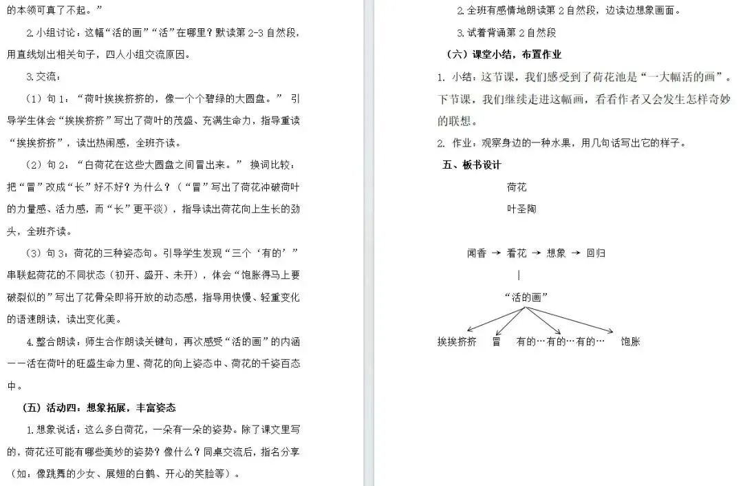 师:从你们的朗读声中,老师似乎看到了荷叶一片挨着一片,一片挤着一片的样子。哪些词句也能看出这幅画活了起来?