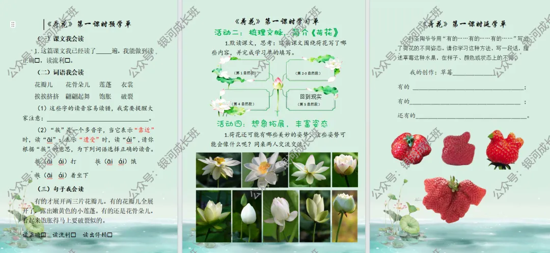 师:读得真有画面感!那这篇课文围绕荷花写了哪些内容呢,请同学们默读课文,同桌合作完成学习单的填写。