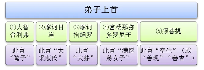 经文:其名曰。大智舍利弗。摩诃目犍连。摩诃拘絺罗。富楼那弥多罗尼子。须菩提。优波尼沙陀等。而为上首。