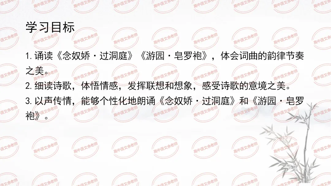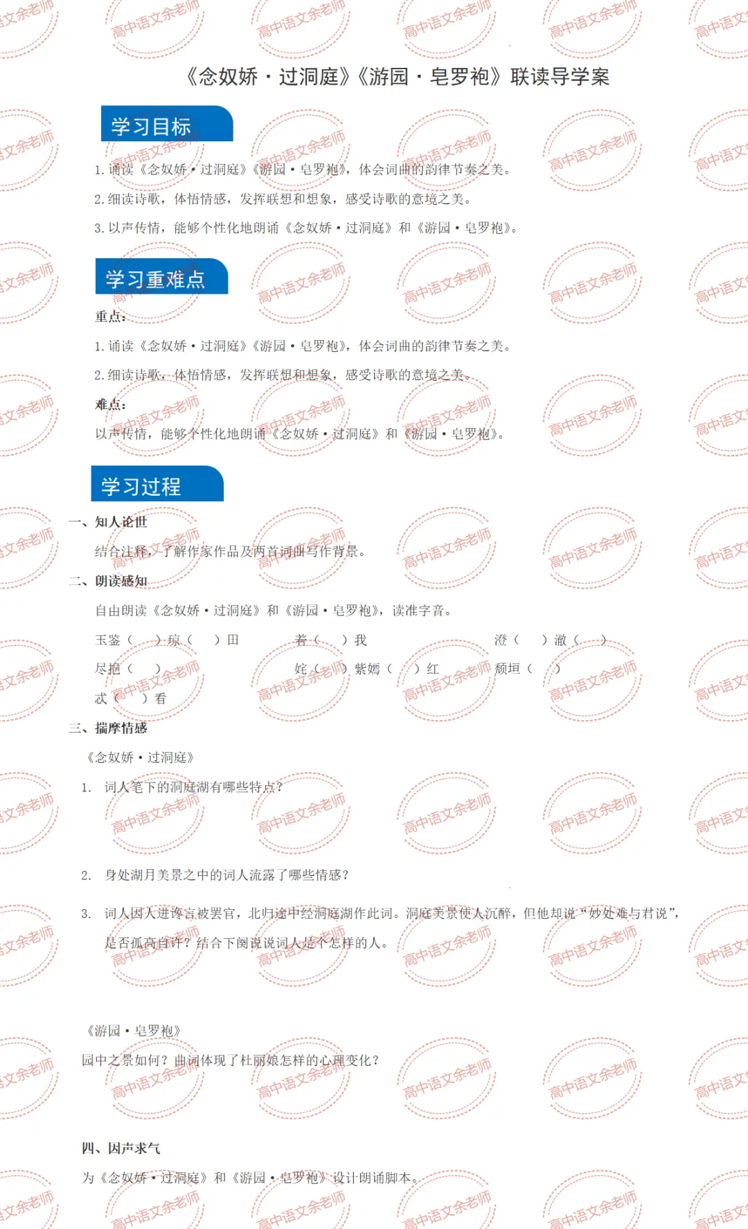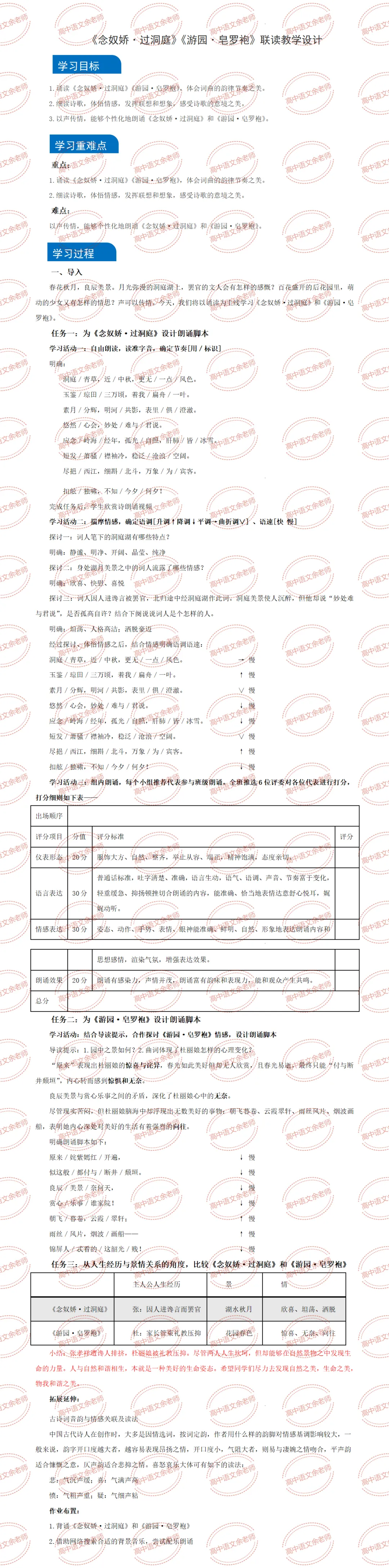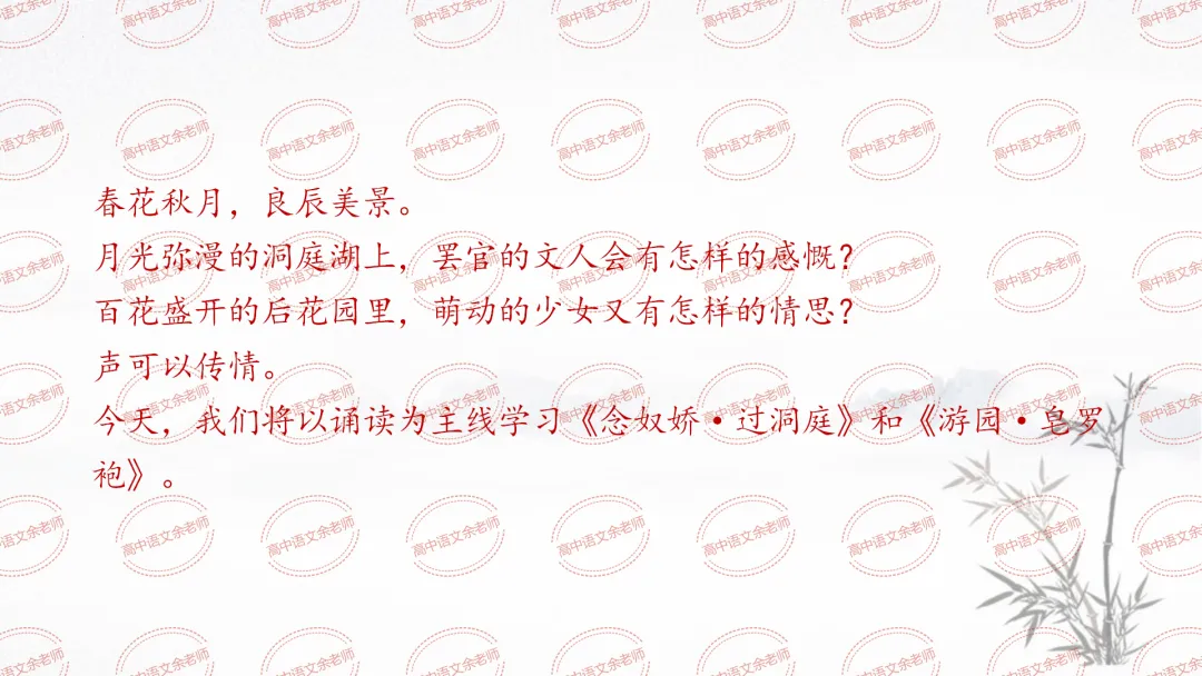 >《念奴娇·过洞庭》《游园·皂罗袍》教案设计及课件PPT 导学案 分层作业 【适配高中语文 必修下册】教师备课