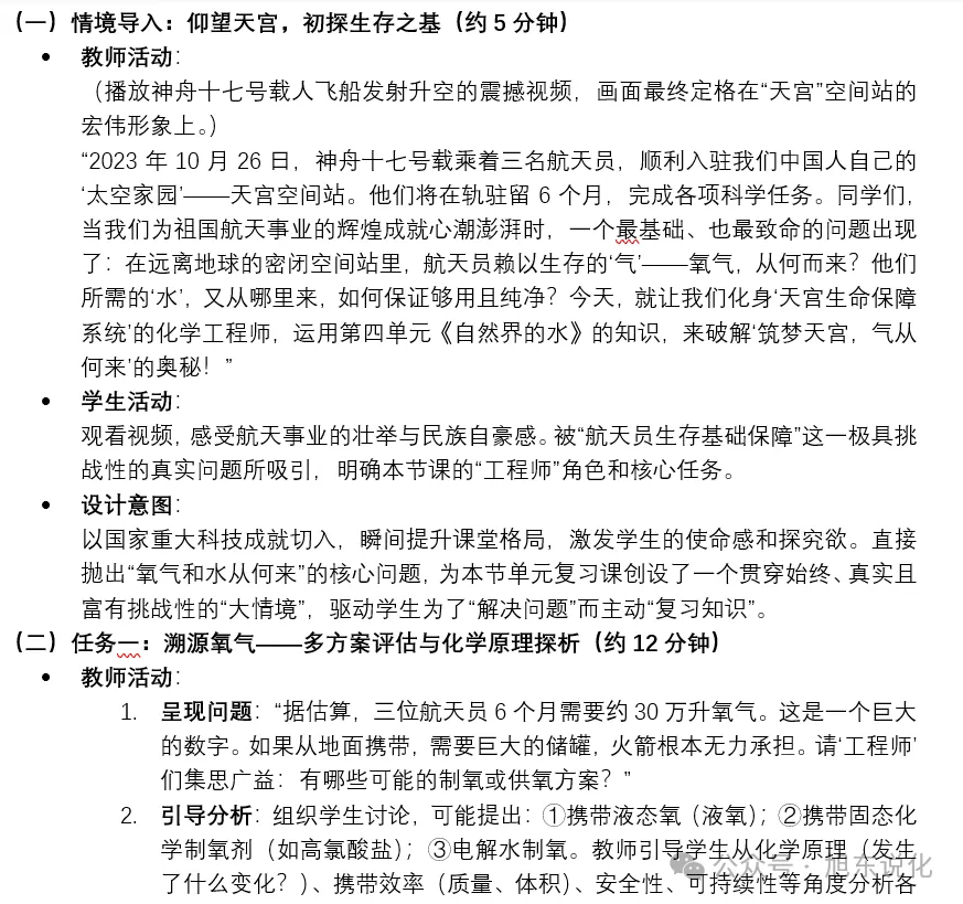 以人教版初中化学第四单元《自然界的水》为复习对象,围绕新课标中“物质的多样性”这一学科大概念,并归属于“物质的性质与应用”学习主题。传统单元复习易陷入知识罗列与习题堆砌的困境,本设计创新性地以“中国空间站(天宫)的氧气与水循环保障”这一国家重大科技工程为真实、连贯、富有使命感的情境,将“水的组成、化学式与化合价、水的净化、物质分类”等原本零散的知识点,统整到“航天员在轨生存保障”这一系列核心问题链中。通过“筑梦天宫,气从何来”的主线,引导学生从“物质组成与转化”的化学视角,分析并解决空间站中氧气制备、水电解、水资源循环利用等复杂系统问题,实现知识的结构化重构与核心素养的深度融合。