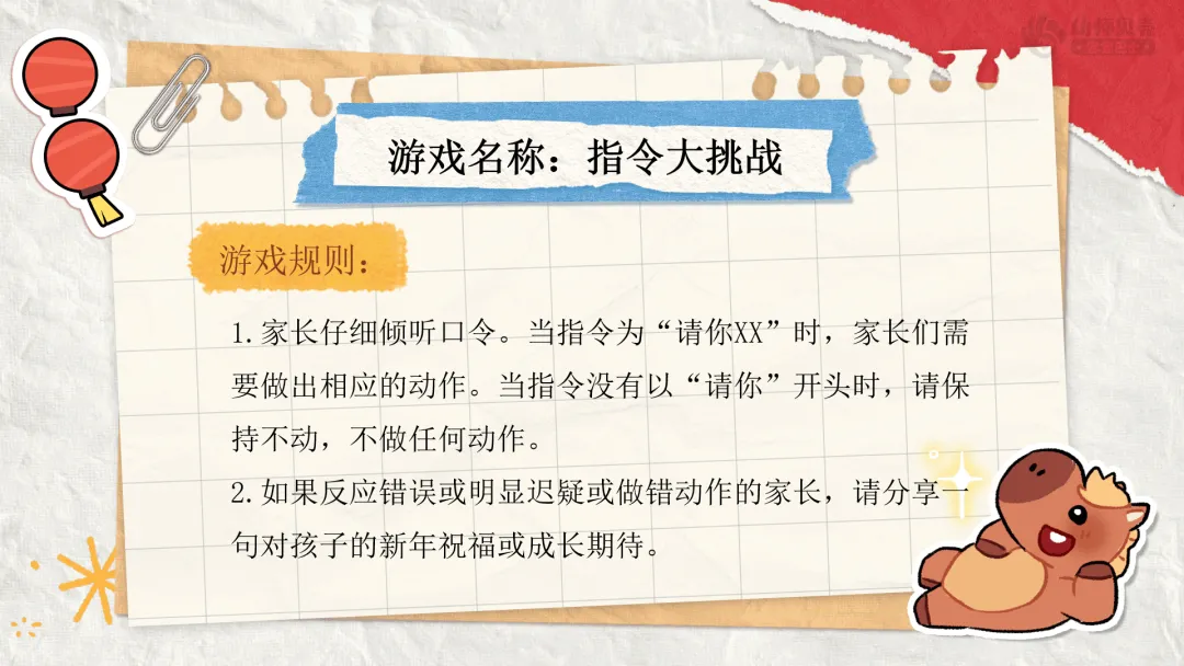 游戏开场语:接下来,我们将进行一个名为“指令大挑战”的简单反应力游戏。请全体家长保持坐姿,认真听我的指令。当我说的指令以“请你……”开头时,请大家立刻做出相应动作;如果指令没有以“请你”开头,则请不要做任何动作。反应错误或明显迟疑的家长,将被邀请分享一句对孩子的祝福或新年期待。