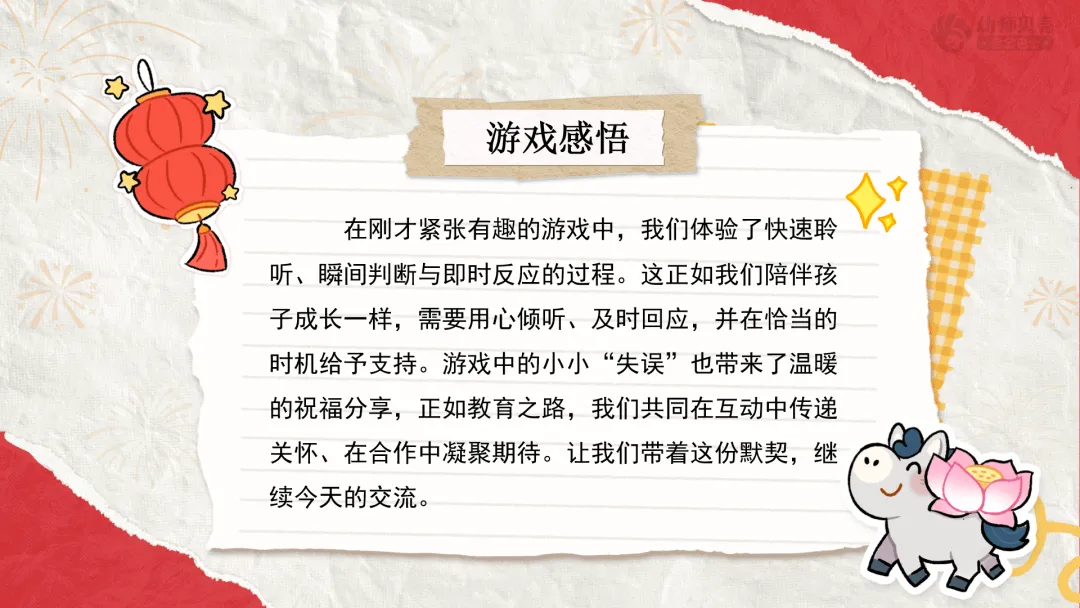 游戏总结:在刚才紧张有趣的游戏中,我们体验了快速聆听、瞬间判断与即时反应的过程。这正如我们陪伴孩子成长一样,需要用心倾听、及时回应,并在恰当的时机给予支持。游戏中的小小“失误”也带来了温暖的祝福分享,正如教育之路,我们共同在互动中传递关怀、在合作中凝聚期待。让我们带着这份默契,继续今晚的深入交流。
