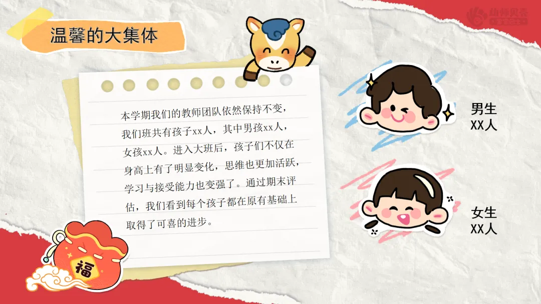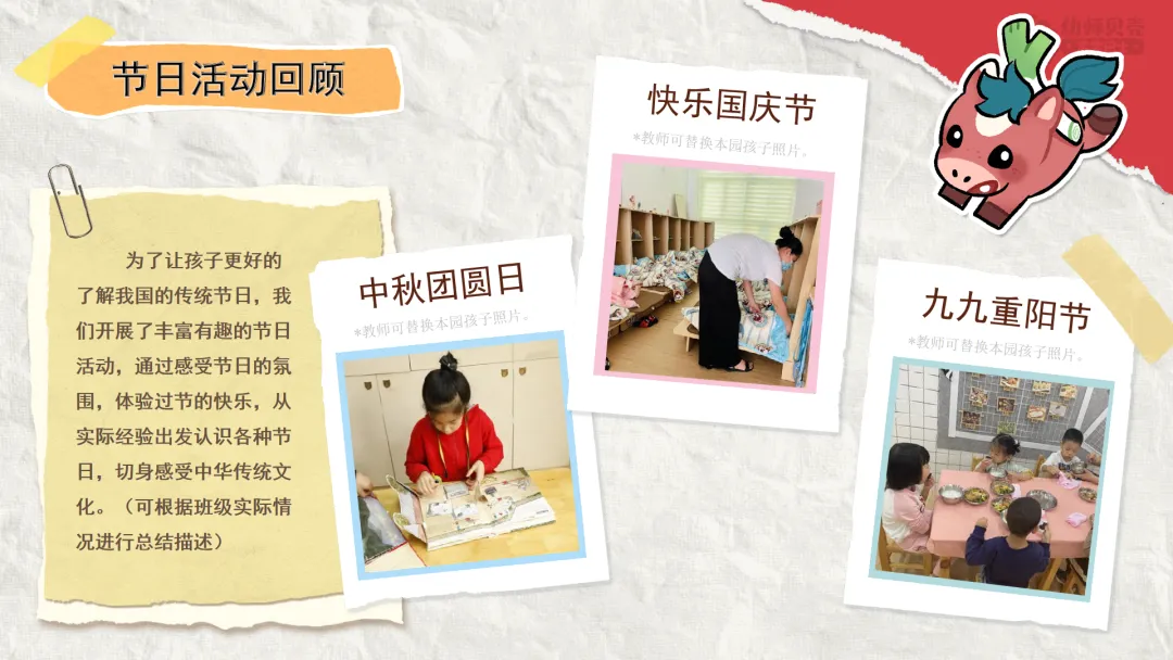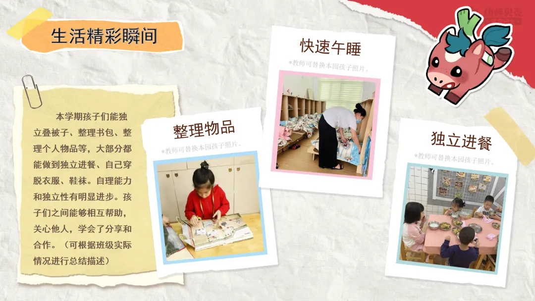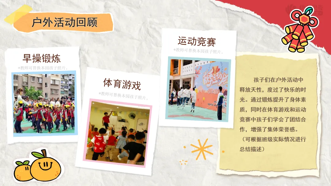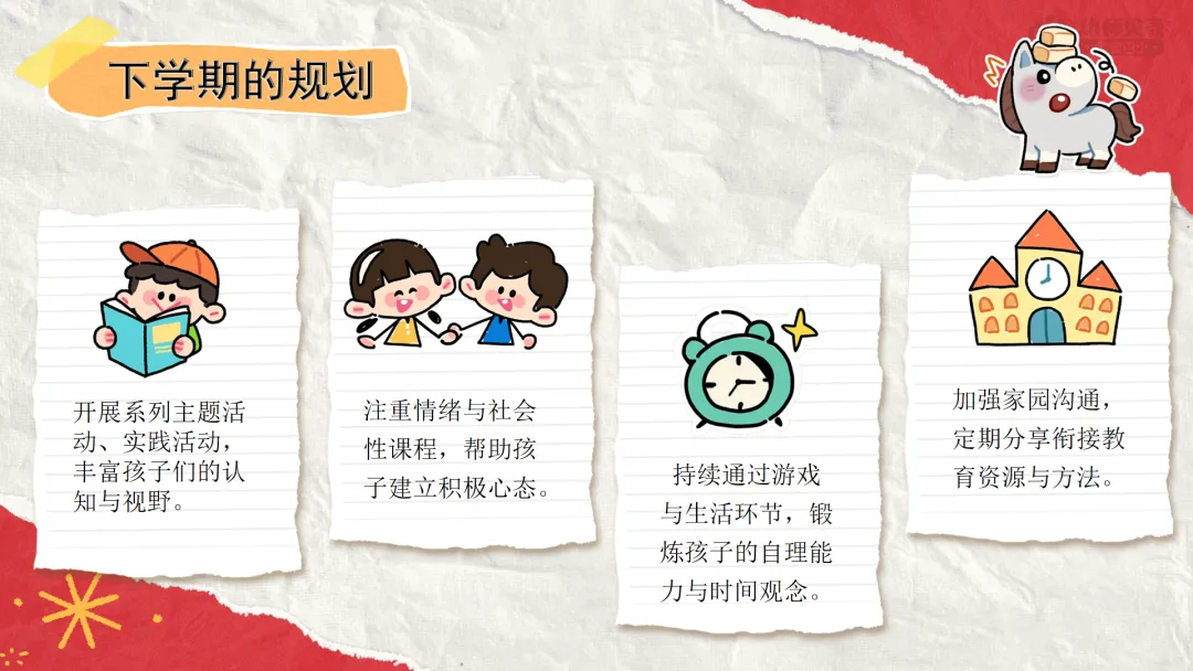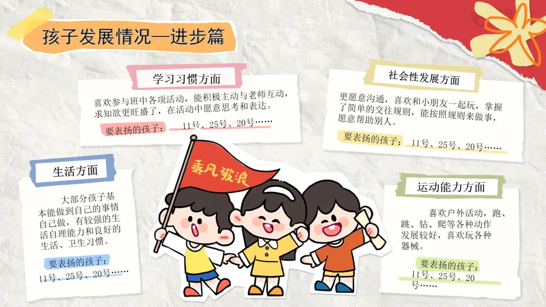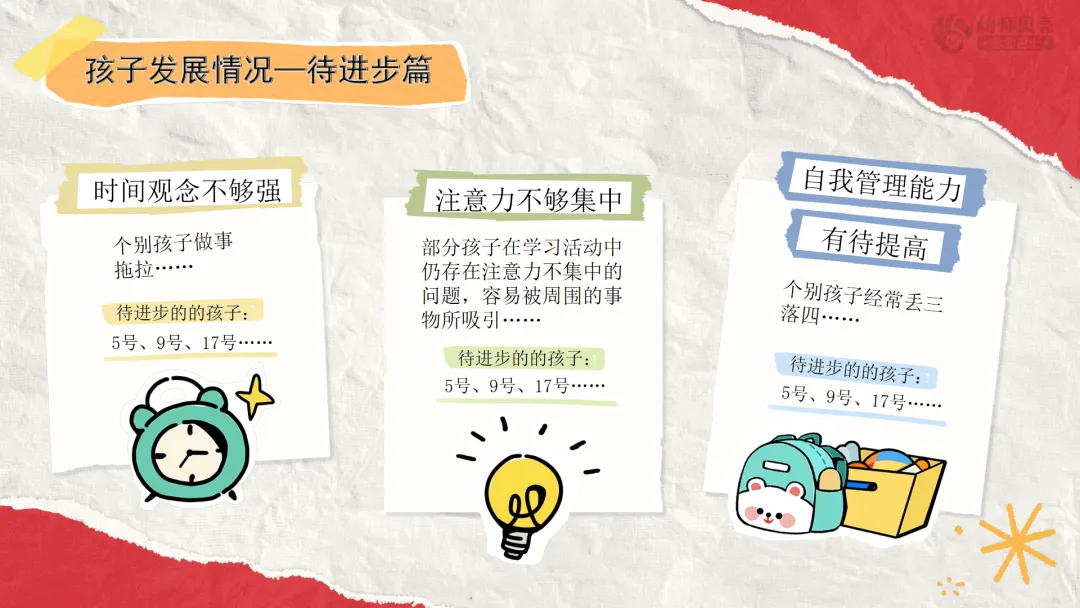 小结:孩子们在语言表达、动手能力、社交合作等方面均有显著提升,但也存在如注意力持续性不足、任务完成独立性有待加强等情况。作为老师和家长,我们应共同关注孩子的成长需求,提供更有针对性的支持与引导,帮助他们稳步向前。