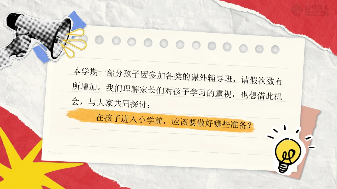 在正式介绍本学期幼小衔接工作之前,我想先和家长们交流一个现象:我们注意到,本学期一部分孩子因参加各类的课外辅导班,请假次数有所增加。我们理解家长们对孩子们学习的重视,也想借此机会,与大家共同探讨:在孩子进入小学前,应该要做好哪些重要准备的?