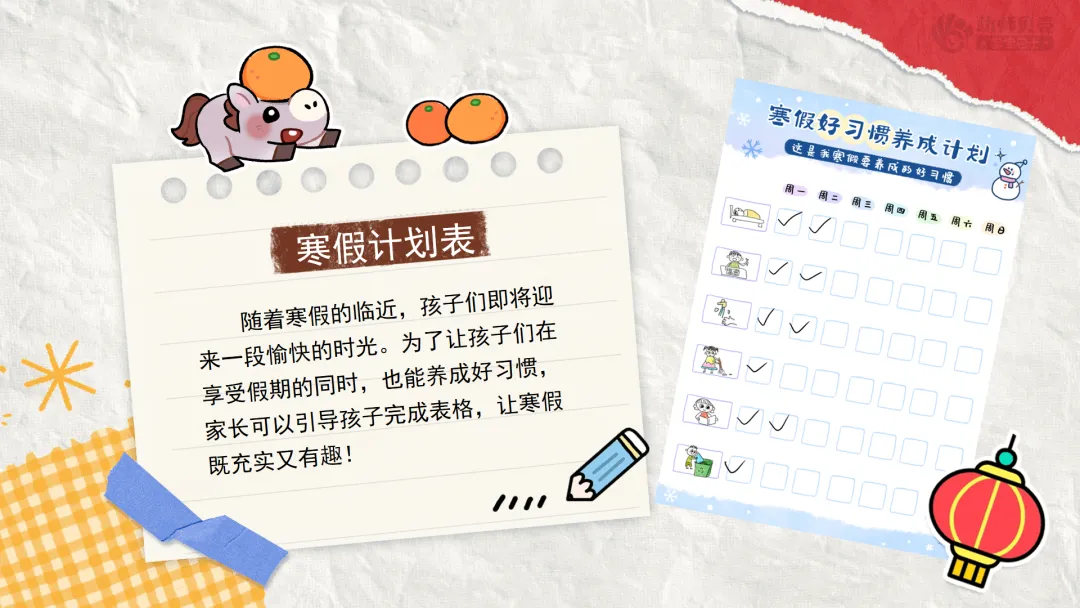 小结:总之,寒假是一个充满机遇和挑战的时期。我们希望家长们能够充分利用这段时间,与孩子们一起制定并执行合理的计划,让他们在快乐中成长,在成长中收获。