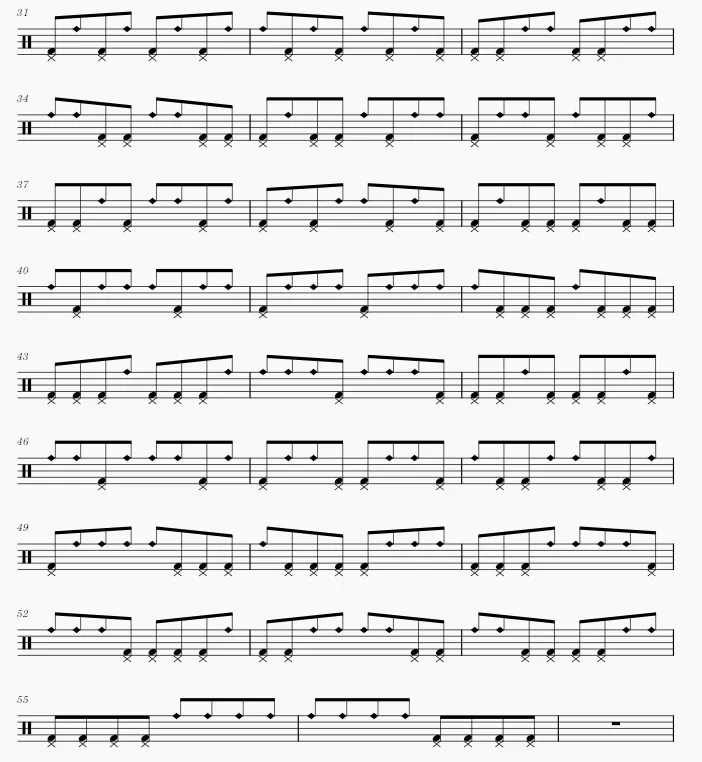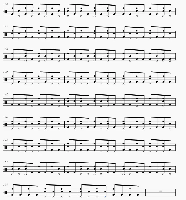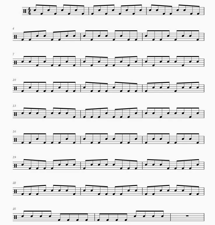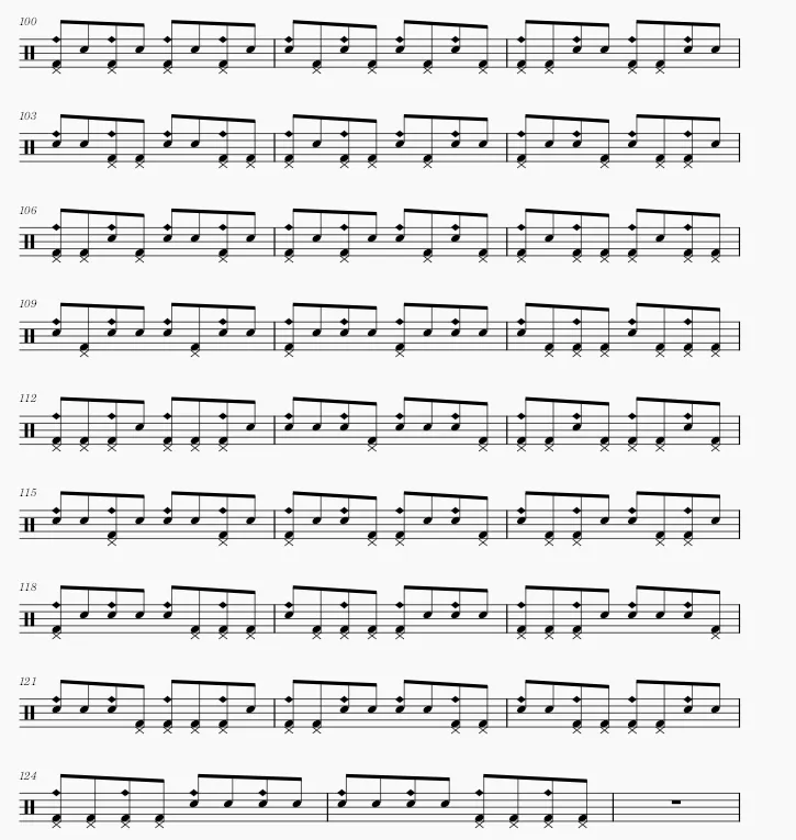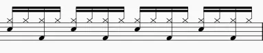 由练习一的基础上而来,保持练习一的军鼓和底鼓规律,八分音符,R为军鼓,L为底鼓,在此基础上每拍填满16分音符H.H击打。