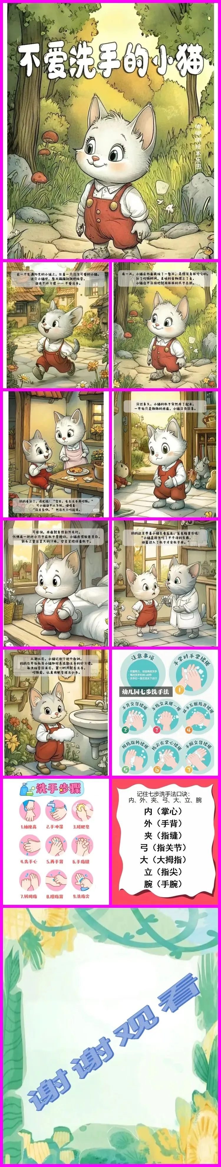 1.绘本《不爱洗手的小猫》PPT课件(包含故事完整图片和文字)。