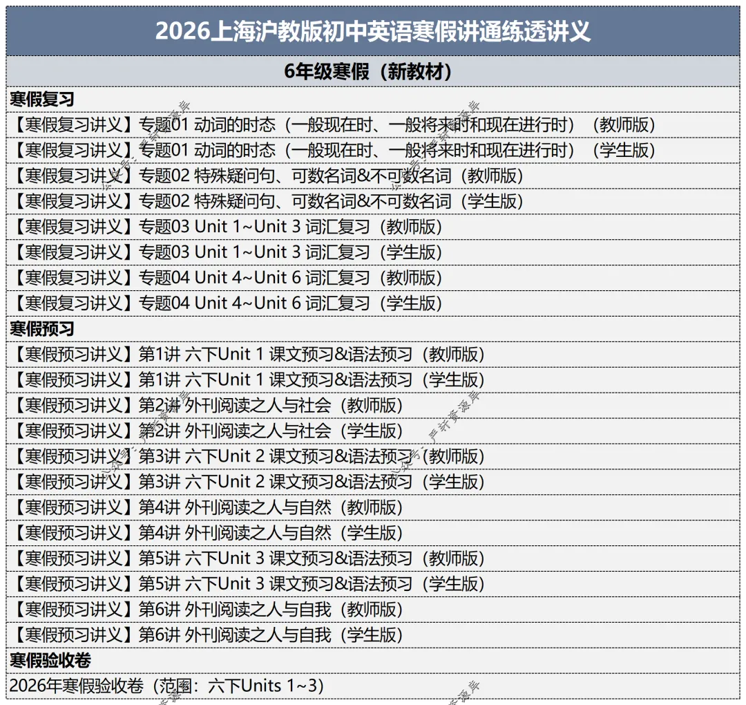 ①2026六年级英语寒假讲通练透复习+预习讲义(教师版+学生版),复习4专题+预习6专题+验收卷,内含:知识精讲、好题精练、知识精讲、综合提升练。