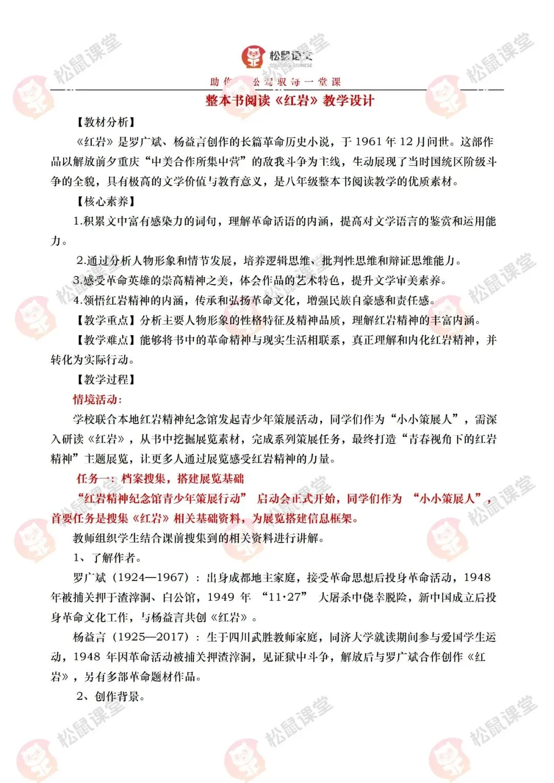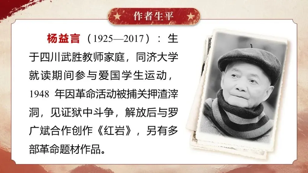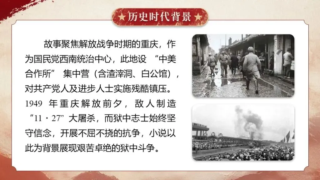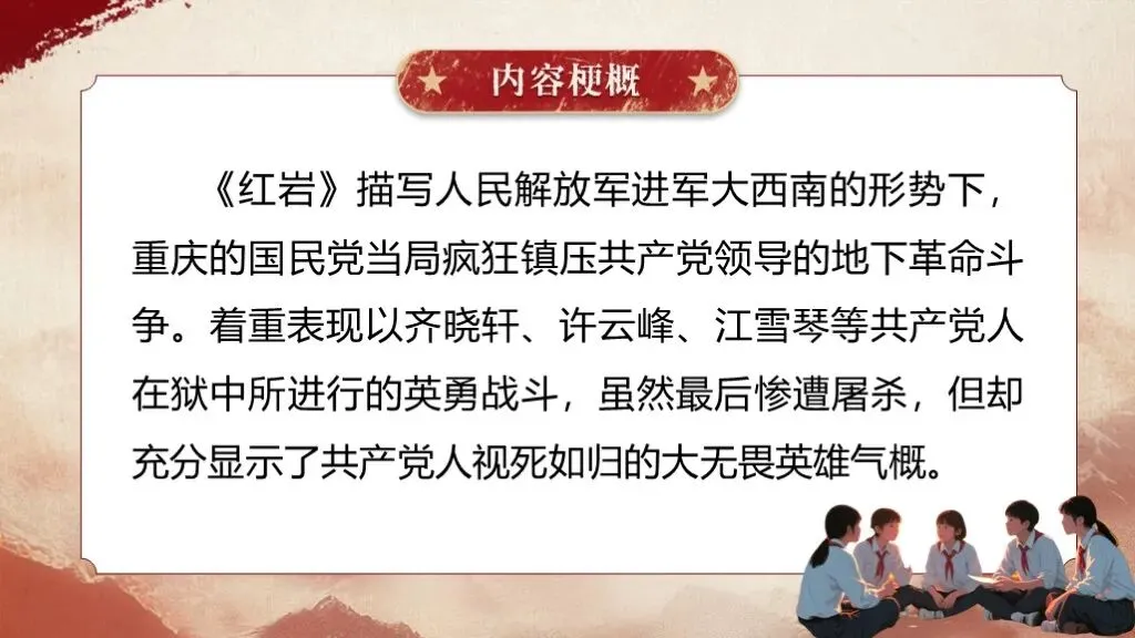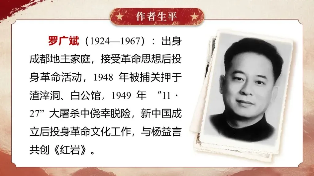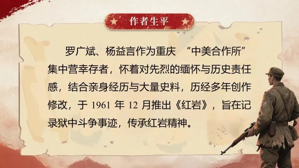 《红岩》是罗广斌、杨益言创作的长篇革命历史小说,于1961年12月问世。这部作品以解放前夕重庆“中美合作所集中营”的敌我斗争为主线,生动展现了当时国统区阶级斗争的全貌,具有极高的文学价值与教育意义,是八年级整本书阅读教学的优质素材。