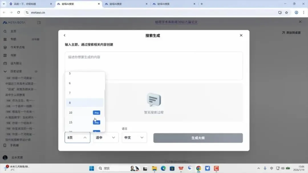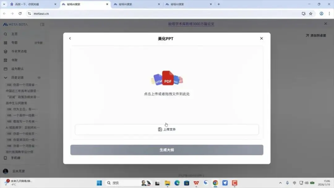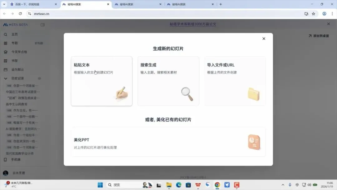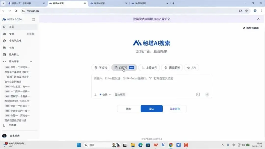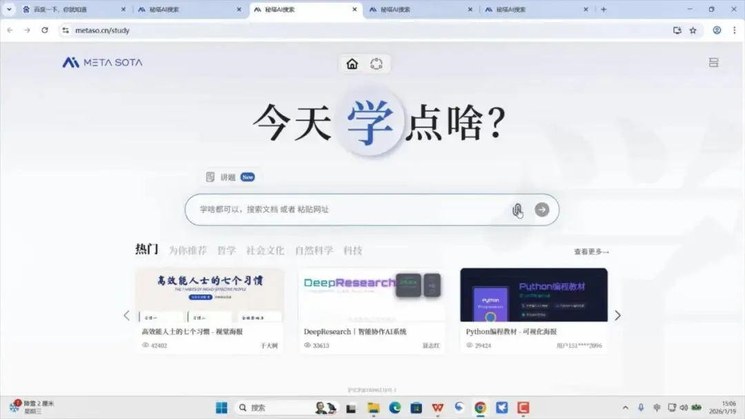 打开秘塔搜索主页https://metaso.cn/